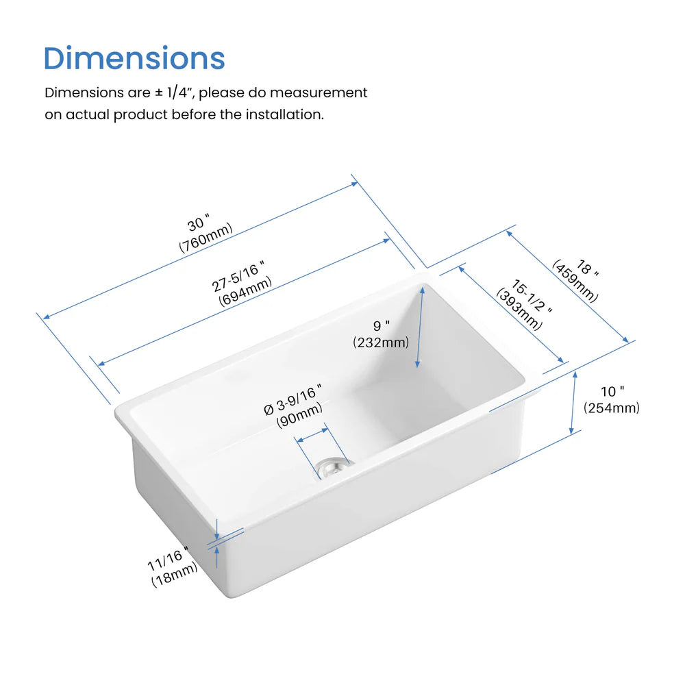 - Dimension Variations: Due to the firing process and the handcrafted nature of fireclay sinks, there may be slight variations in dimensions. It's important to note that dimensions can vary up to 3/8", so it's recommended to measure the countertop cut-outs after the sink is secured on the sink cabinet for precise installation.