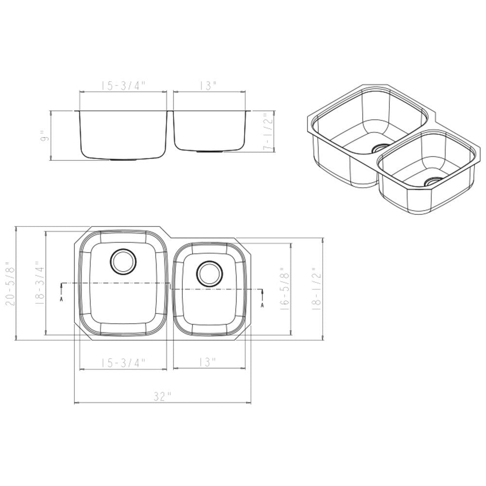 32" L x 20-5/8" W x 9" D Undermount 18 Gauge Stainless Steel 60/40 Double Bowl Sink