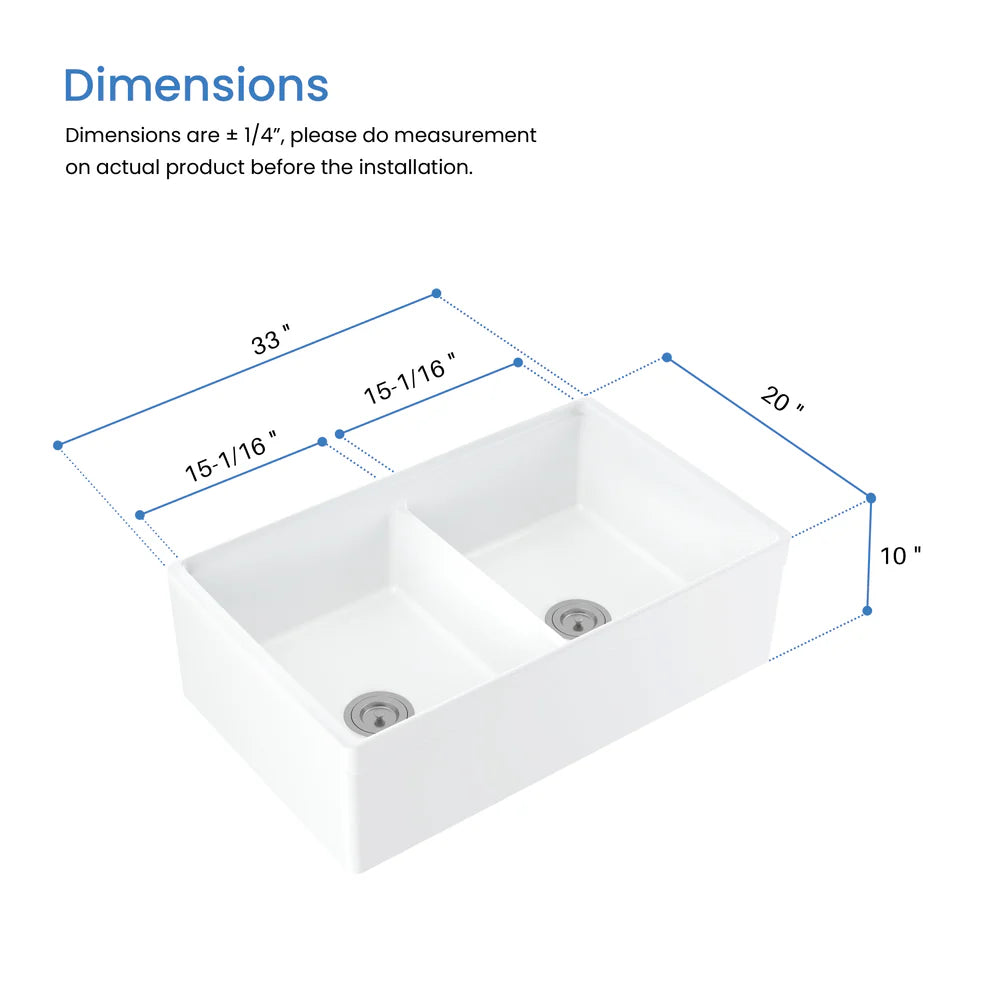 - Dimension Variations: Due to the firing process and the handcrafted nature of fireclay sinks, there may be slight variations in dimensions. It's important to note that dimensions can vary up to 3/8", so it's recommended to measure the countertop cut-outs after the sink is secured on the sink cabinet for precise installation.