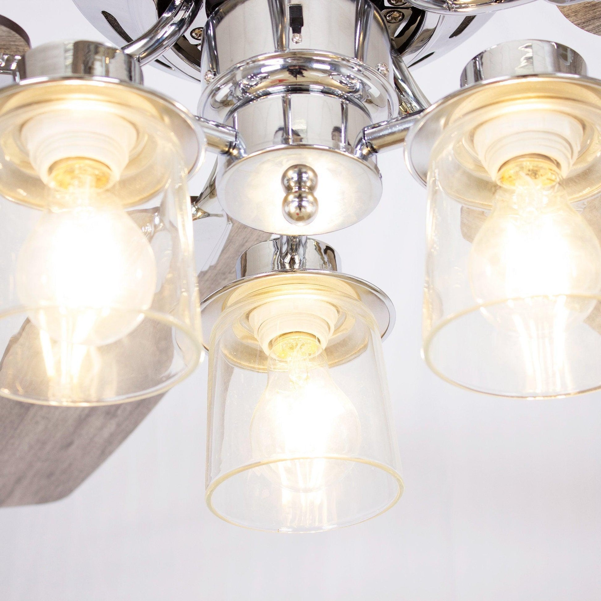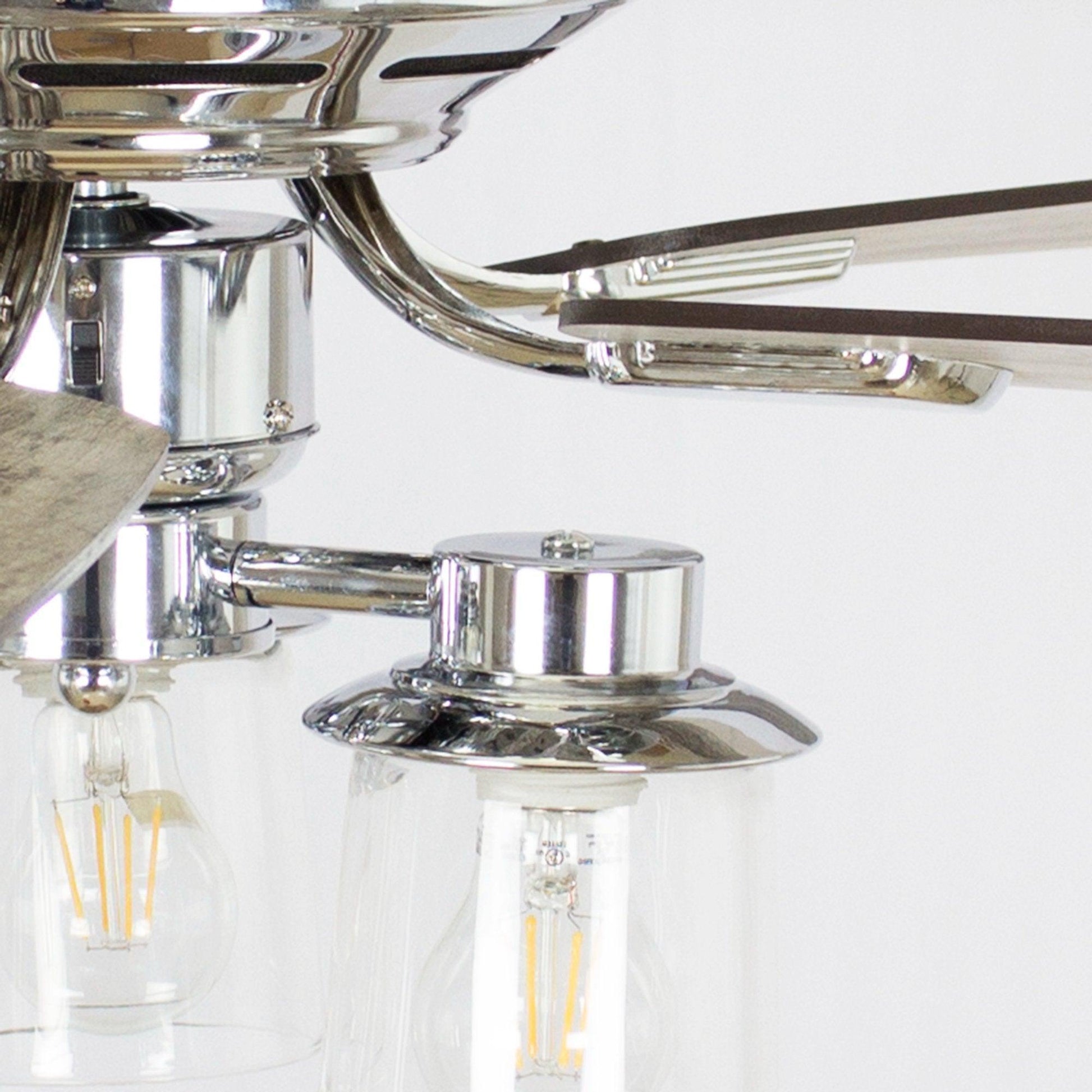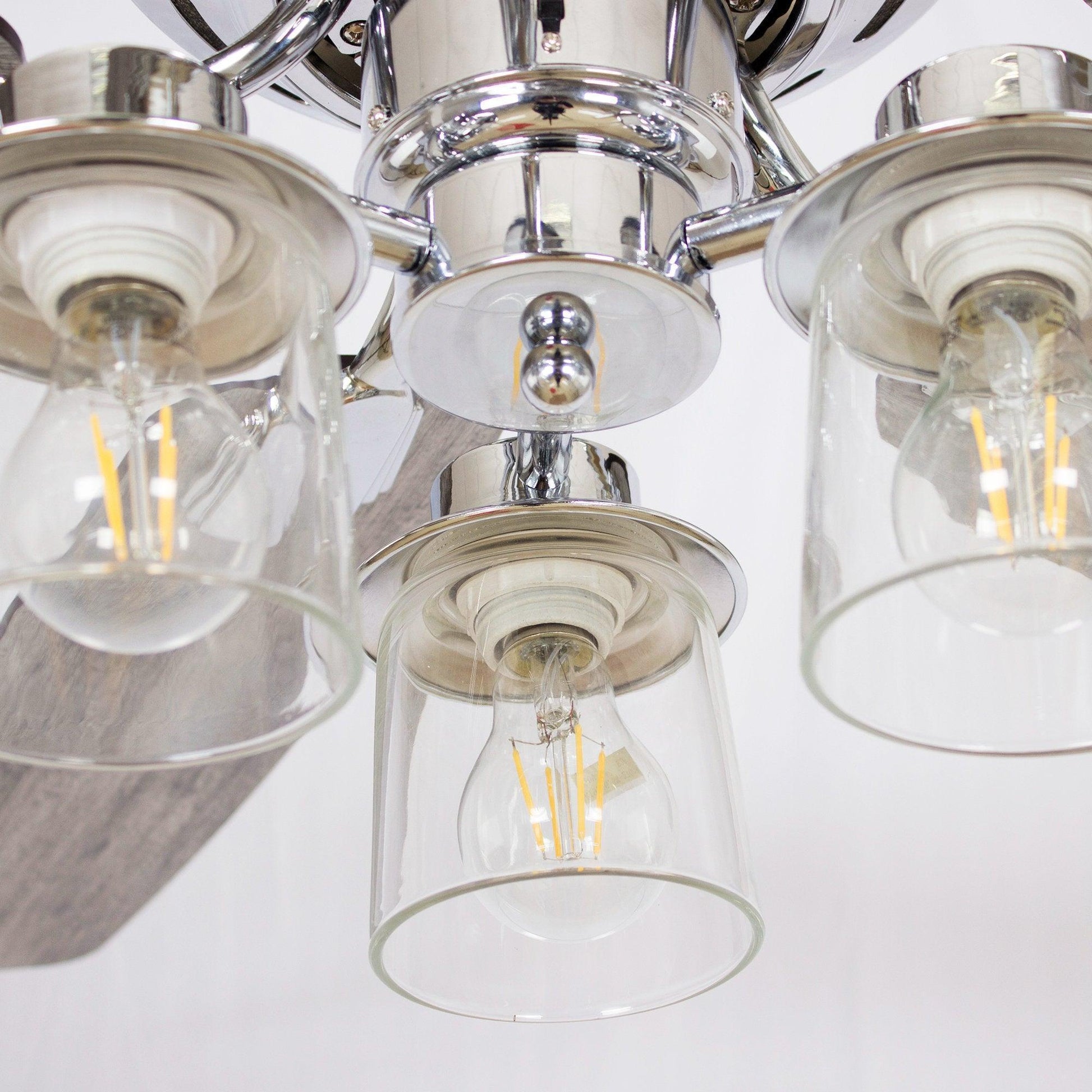 Add a nice touch to your home with this chrome and wooden globe ceiling fan. This 52-inch ceiling fan is made with three lights and five wooden blades. The motor is reversible so you can control the flow and air you receive. This lighted chandelier ceiling fan has a lovely contemporary design. That is a must-have for your home.