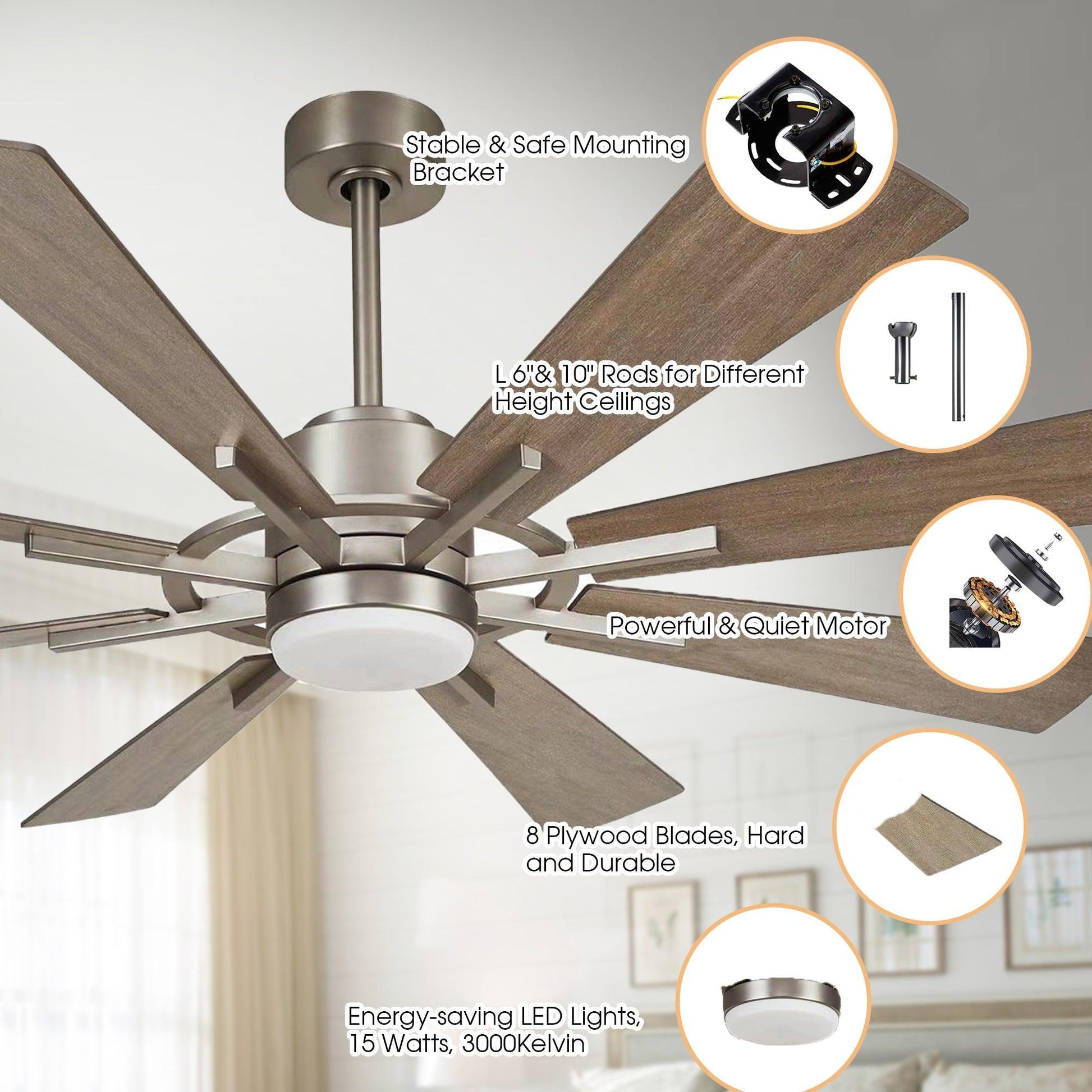 This 60" Farmhouse Fan LED Ceiling Fan, featuring an eye-catching pinwheel silhouette, is adorned with 8 walnut finish blades that bring a rustic farmhouse look to your space. Moreover, energy-efficient LED lights are seamlessly integrated into the white glass shade, catering to your everyday lighting needs. Additionally, the fan can be easily operated with the included remote control. This remote not only simplifies operation, but it also conveniently offers a reverse blade direction feature. Therefore, this ceiling fan is not only stylish but also functional and user-friendly.