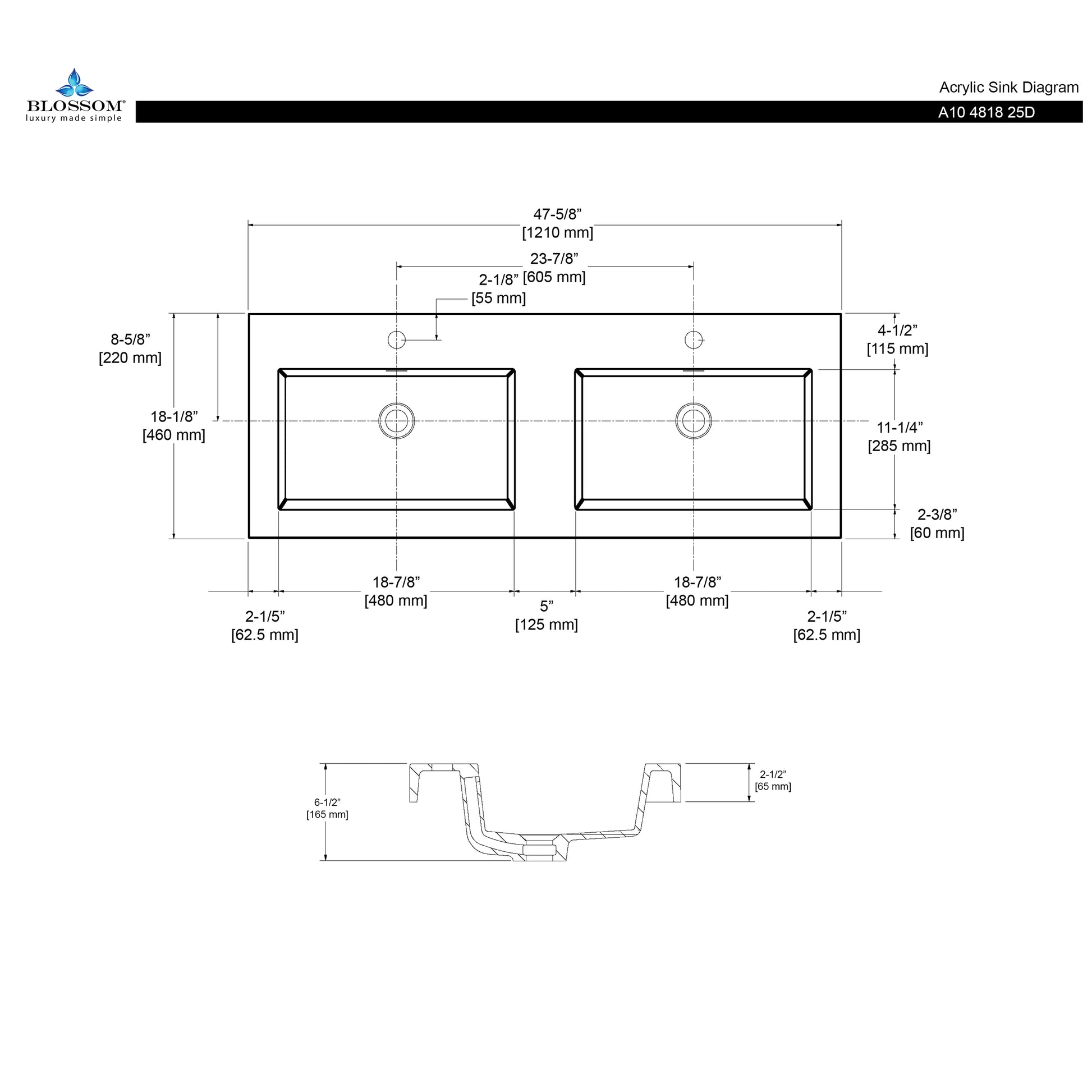 Overall: 47-5/8" W x 18-1/8" D x 2-1/2" H