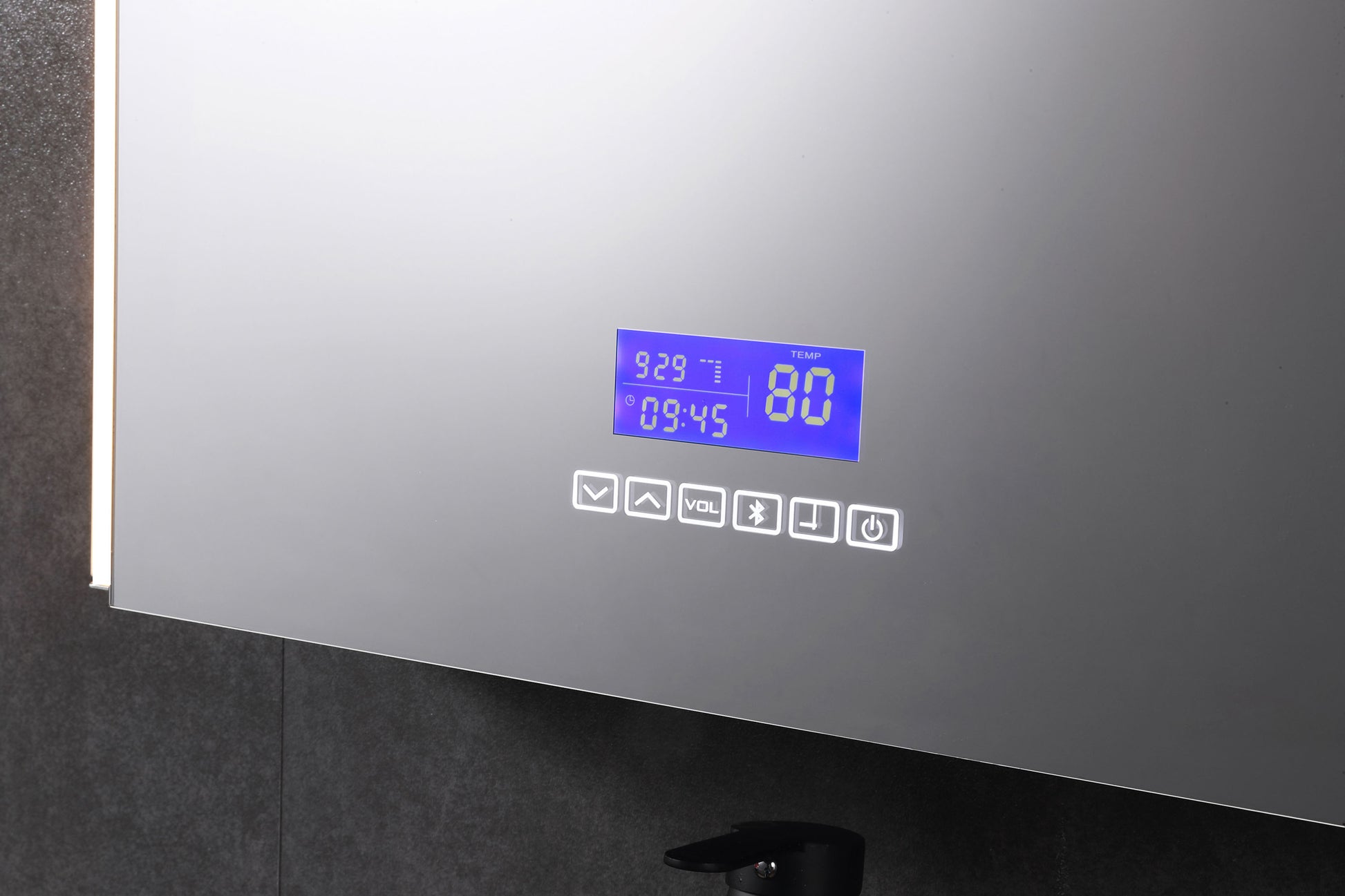 - Featuring Bluetooth connectivity for playing music through the built in speakers. Digital clock and room temperature shown on the screen. Defogger function makes sure that your mirror won't fog up no matter how long of a shower you take :)