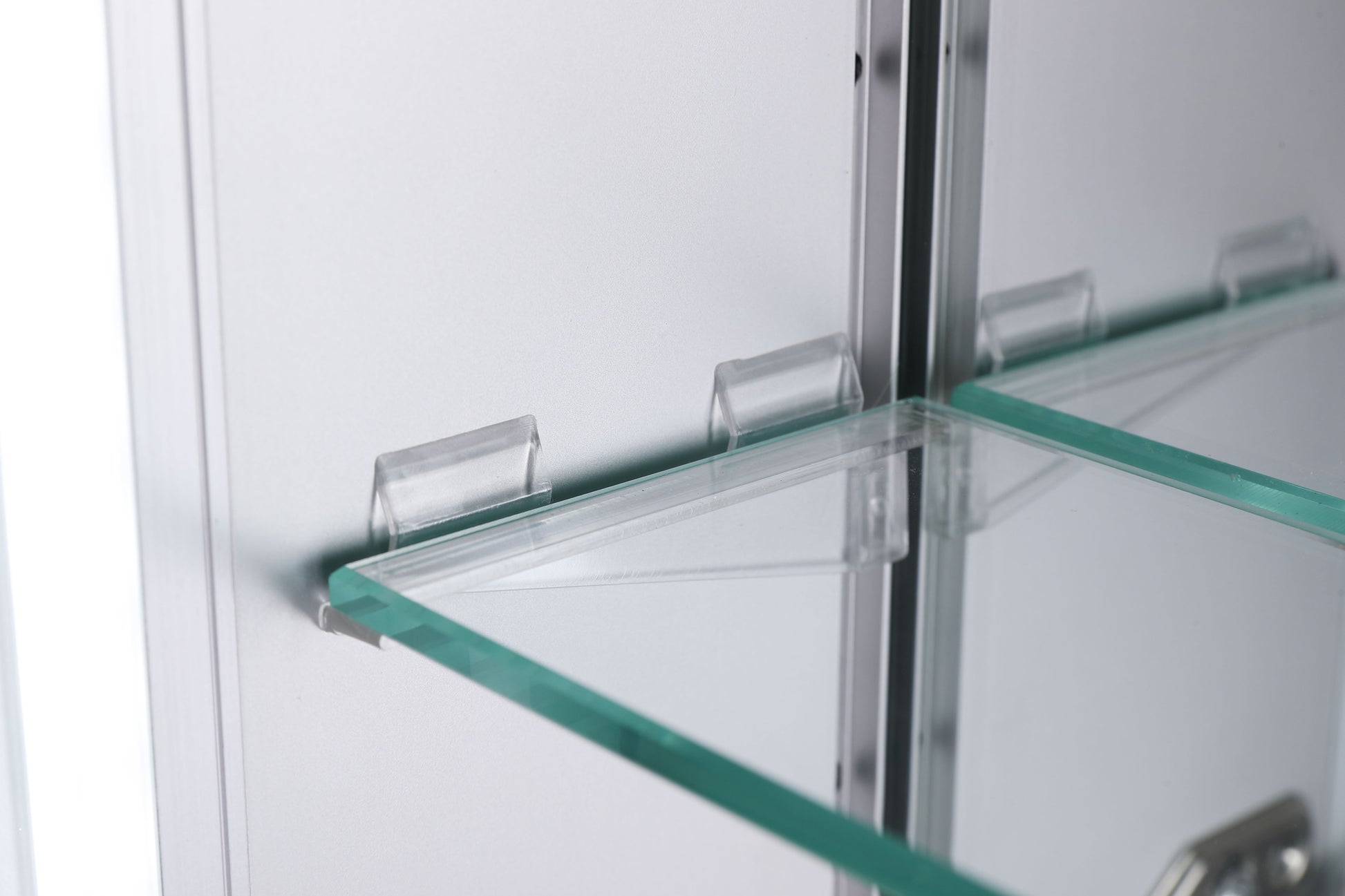 - Includes 4 adjustable height 1/4" thick (6mm) tempered glass shelves that are 3 1/8" (80mm) deep.
