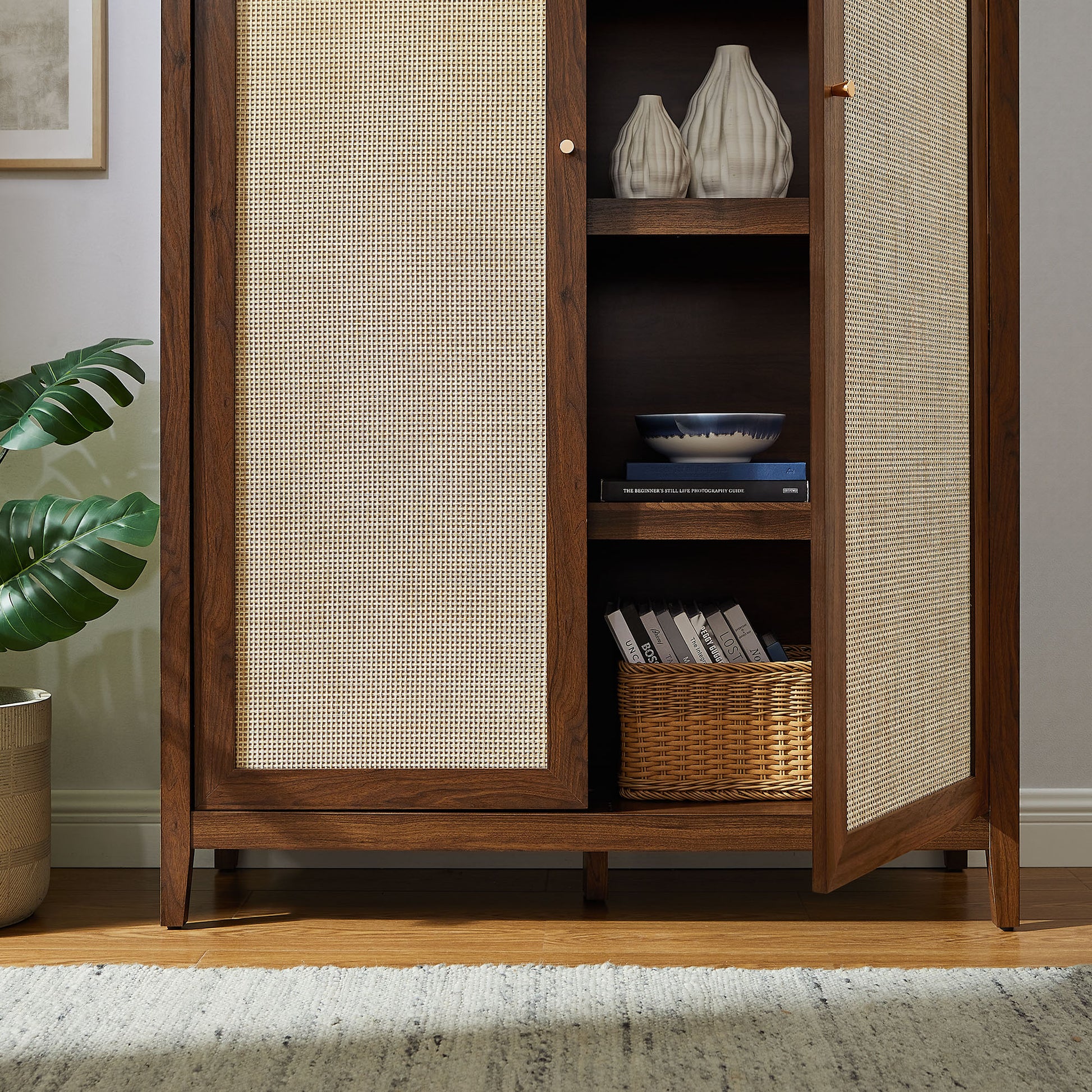 Infuse warmth and elegance into your home with the Calista Arched Storage Cabinet. Standing at 79 inches tall, this spacious linen cabinet blends modern farmhouse charm with functional organization. The gracefully curved arched silhouette is complemented by synthetic rattan paneling on the wood grain laminate doors, offering a natural woven texture with enhanced durability. Perfect for storing linens, seasonal decor, or household essentials, Calista features two adjustable shelves, allowing you to customize the interior space to fit your needs. The soft-close hinges ensure smooth operation, while non-marking adjustable levelers provide stability on any surface. Whether placed in an office, hallway, or living room, this tall storage cabinet with doors and shelves serves as a stylish and practical solution for everyday organization. Assembly required.