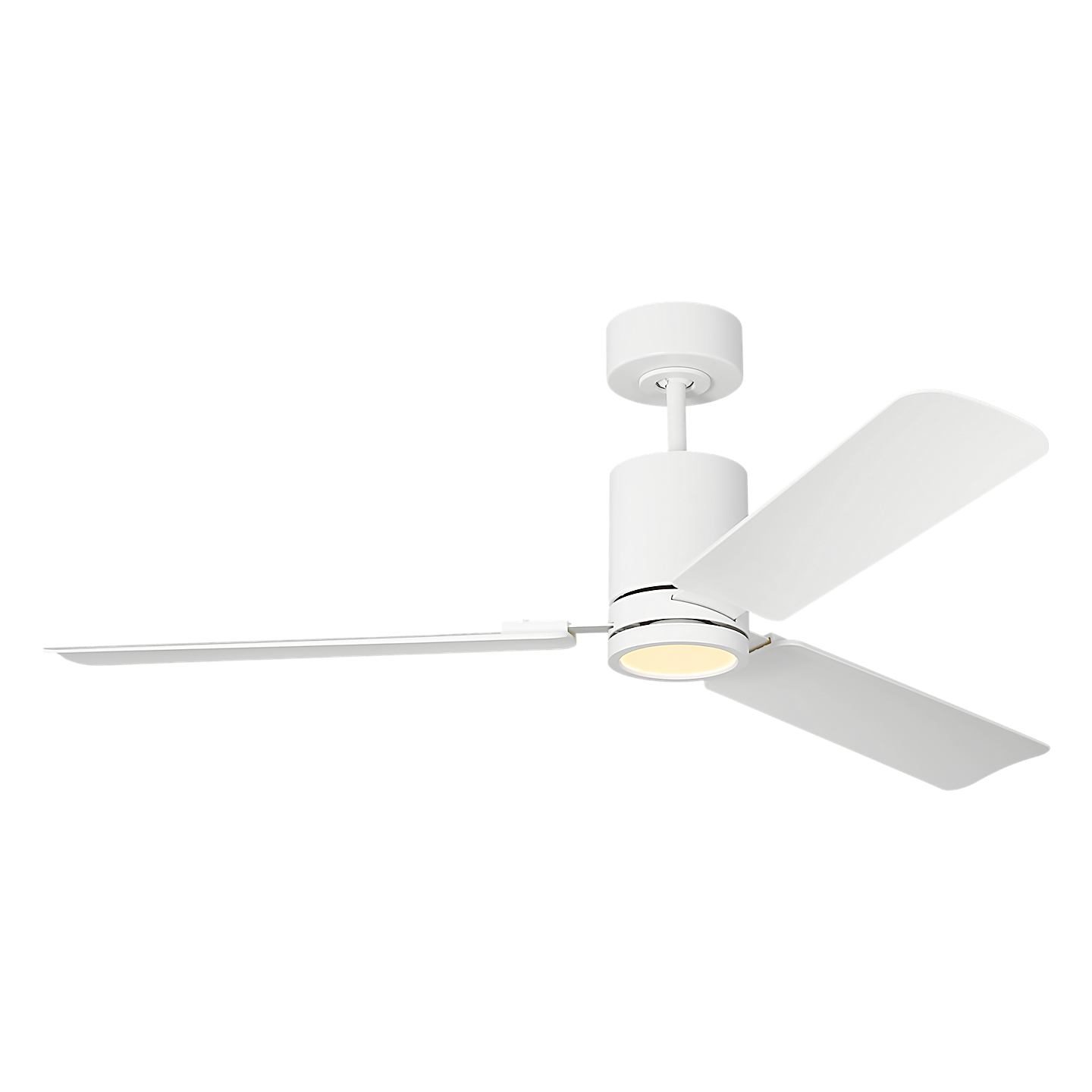 The Matte White Cleancut 54" Smart LED fan by Barbara Barry features sharp yet clean lines and a minimal silhouette with the option to install blade irons in either black or white for an intentional contrast. The fan has an integrated LED light and can be controlled from a phone app. Damp-rated for indoor and outdoor use, the Cleancut fan will lend a crisp and architectural accent to any space.