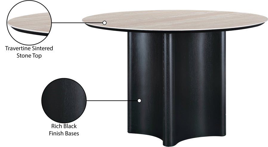 With its sleek silhouette and durable construction, the Corvina travertine sintered stone and black oak veneer dining table is a timeless investment. Its striking contrast of circular sintered stone top and wavy oak veneer base curate a unique design to elevate any space. As a focal point piece, its sophisticated design can be used in a variety of contemporary settings to blend luxury and functionality effortlessly.