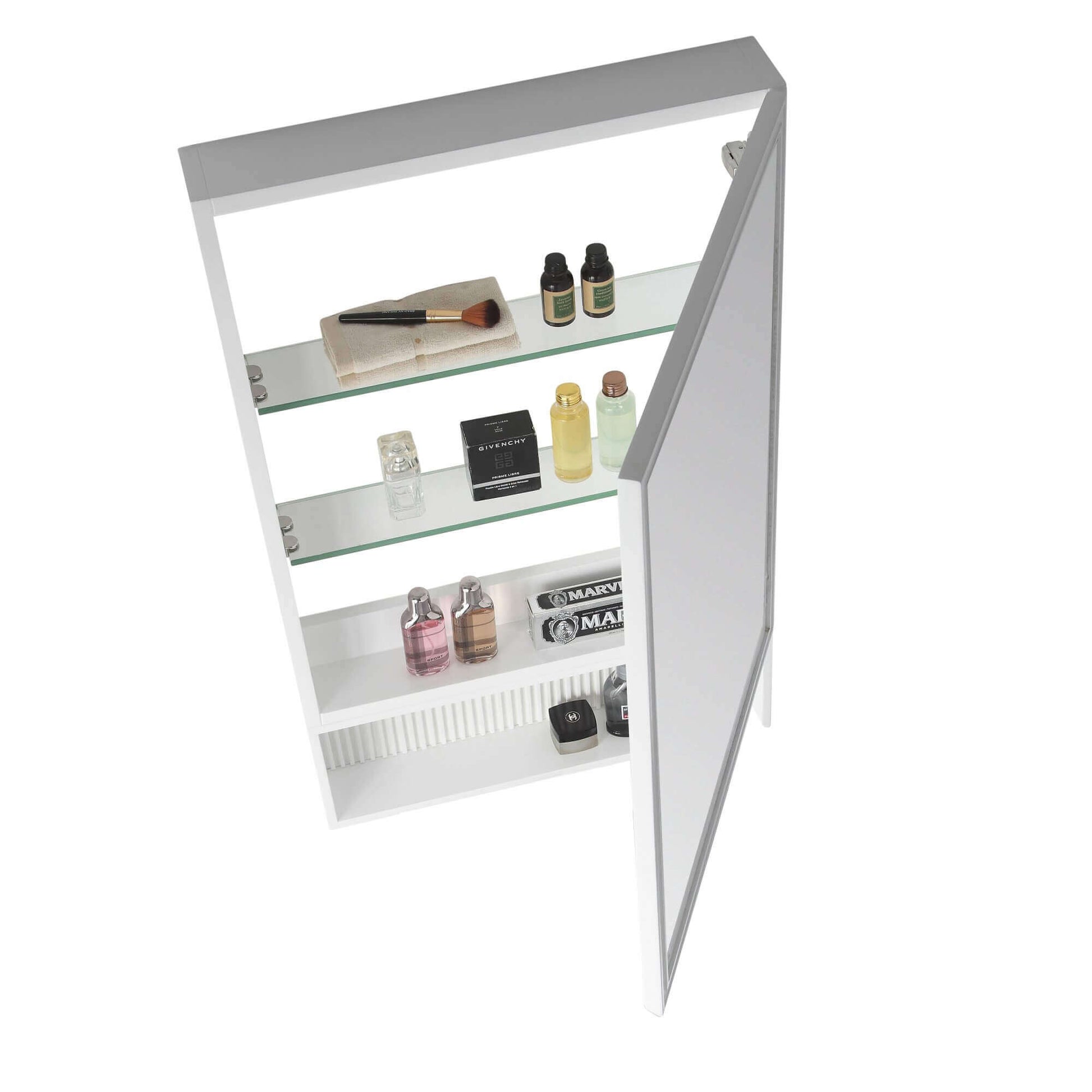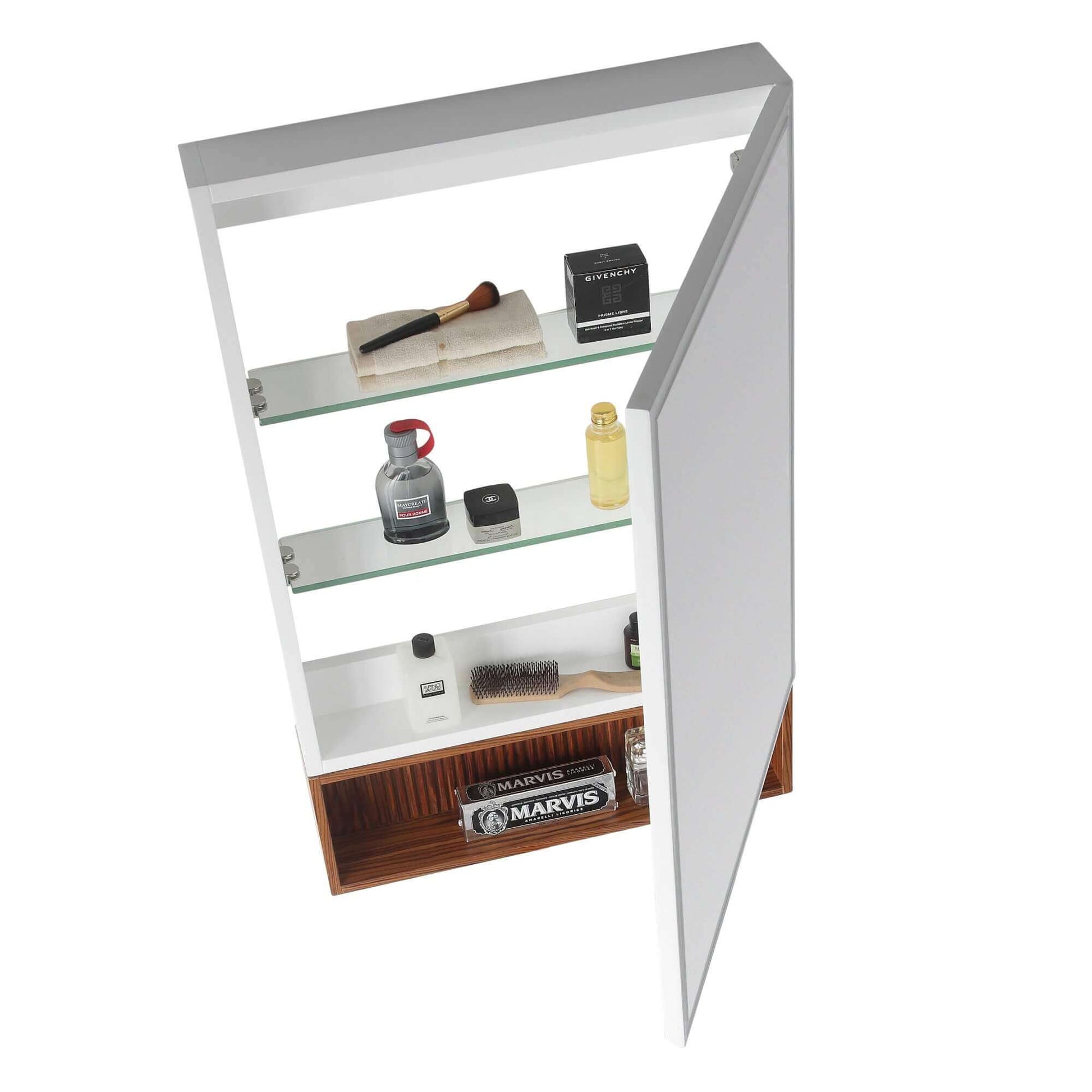 - Available in rock gray or lacquered white mirror frame with rock gray, lacquered white or teak open shelf design.