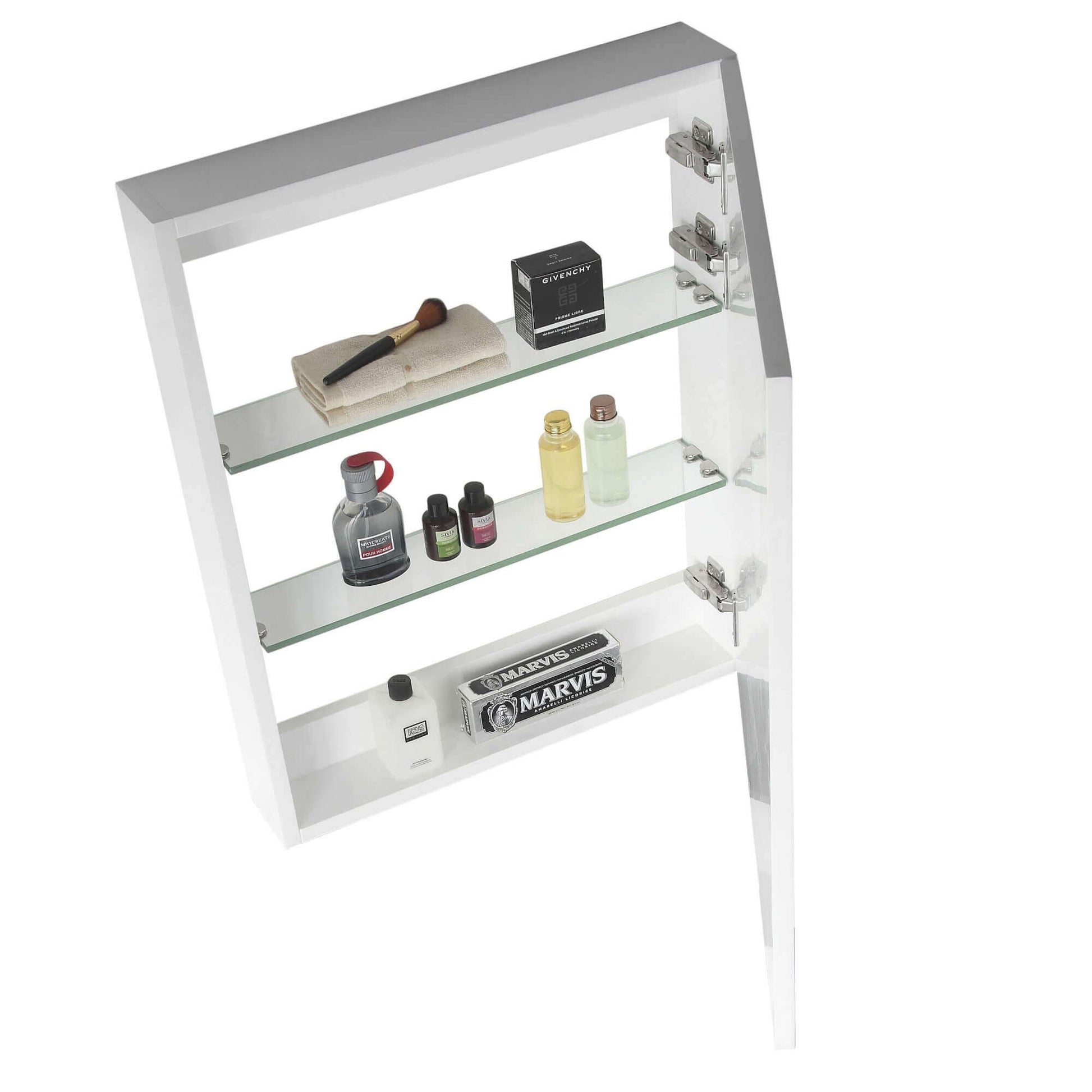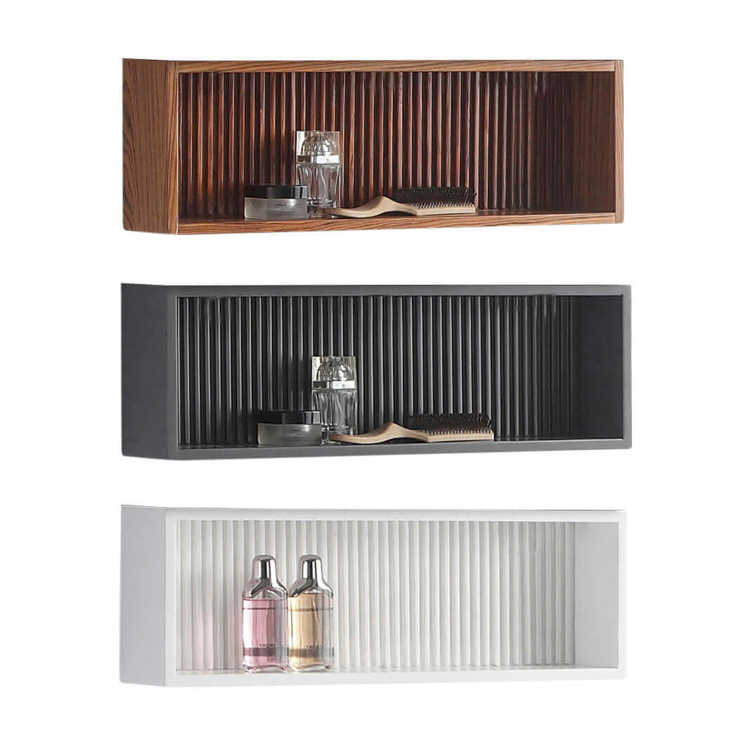 - Available in rock gray or lacquered white mirror frame with rock gray, lacquered white or teak open shelf design.