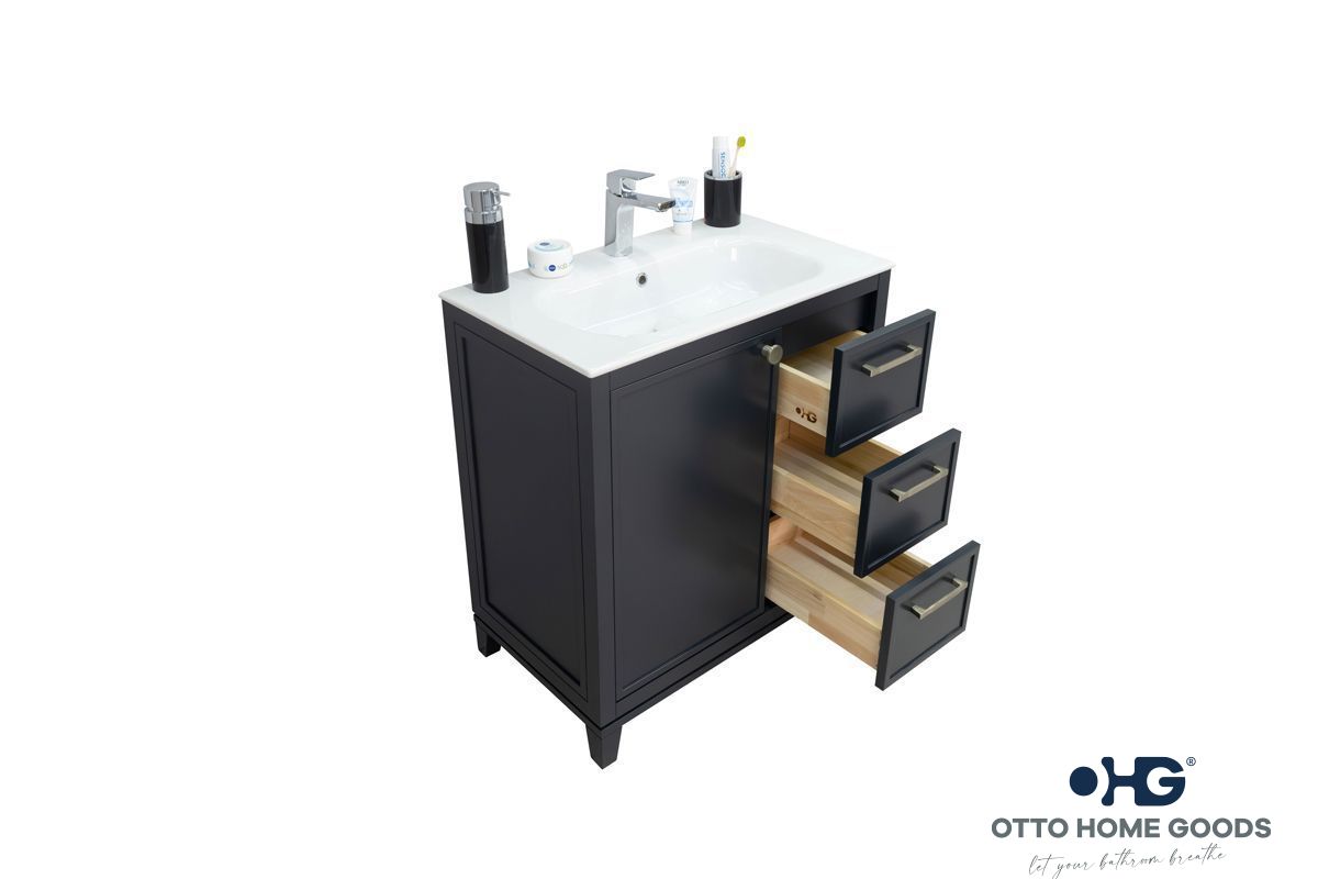 The Frame 30" Dark Gray Bathroom Vanity by Otto Home Goods combines sleek design with functional craftsmanship. Featuring an integrated porcelain sink and top, solid wood drawers, and a durable HDF frame and doors engineered to resist paint cracking, this vanity is built for long-term beauty. Its Hettich German soft-close hardware ensures smooth, quiet operation every time.