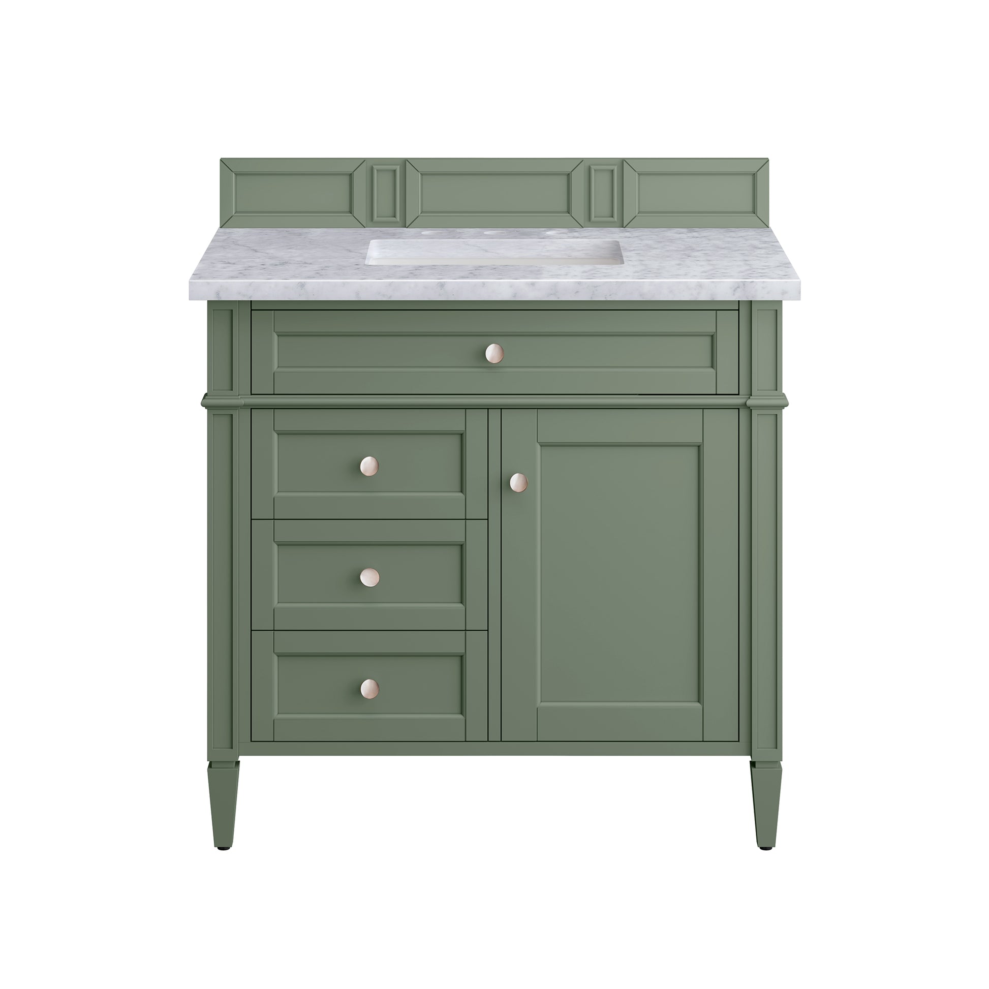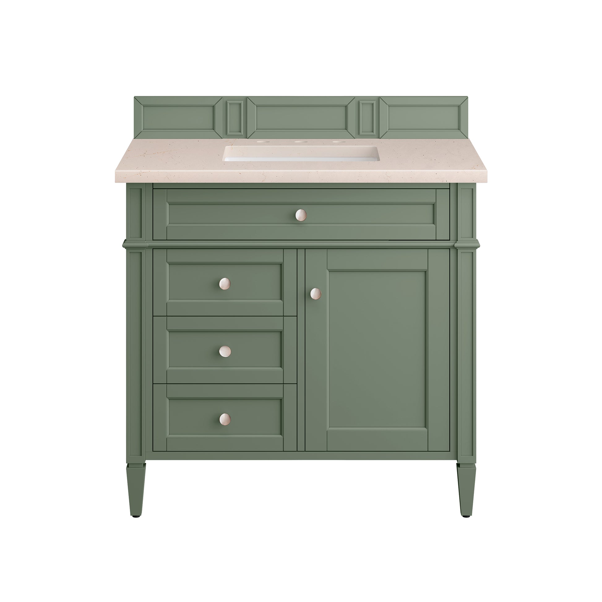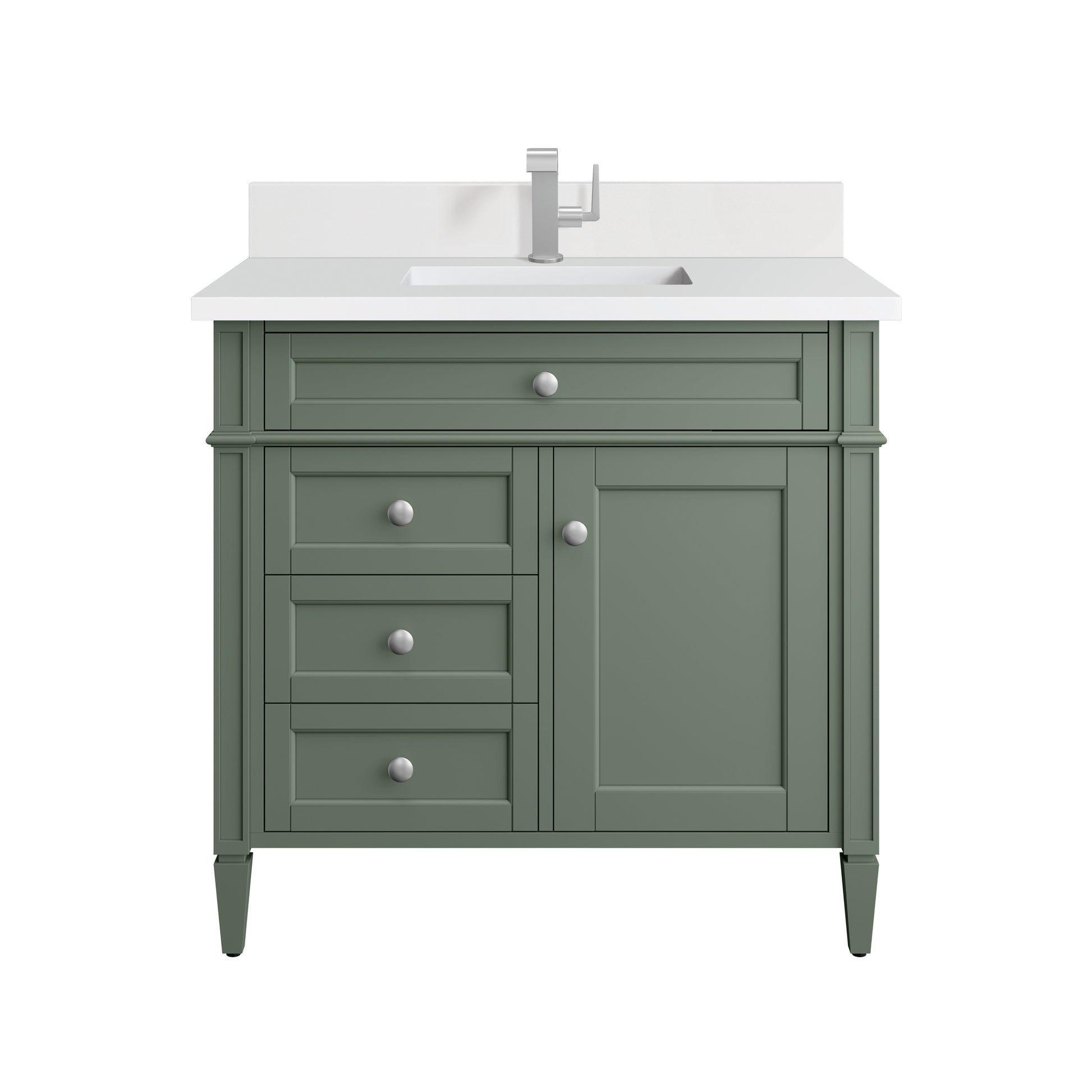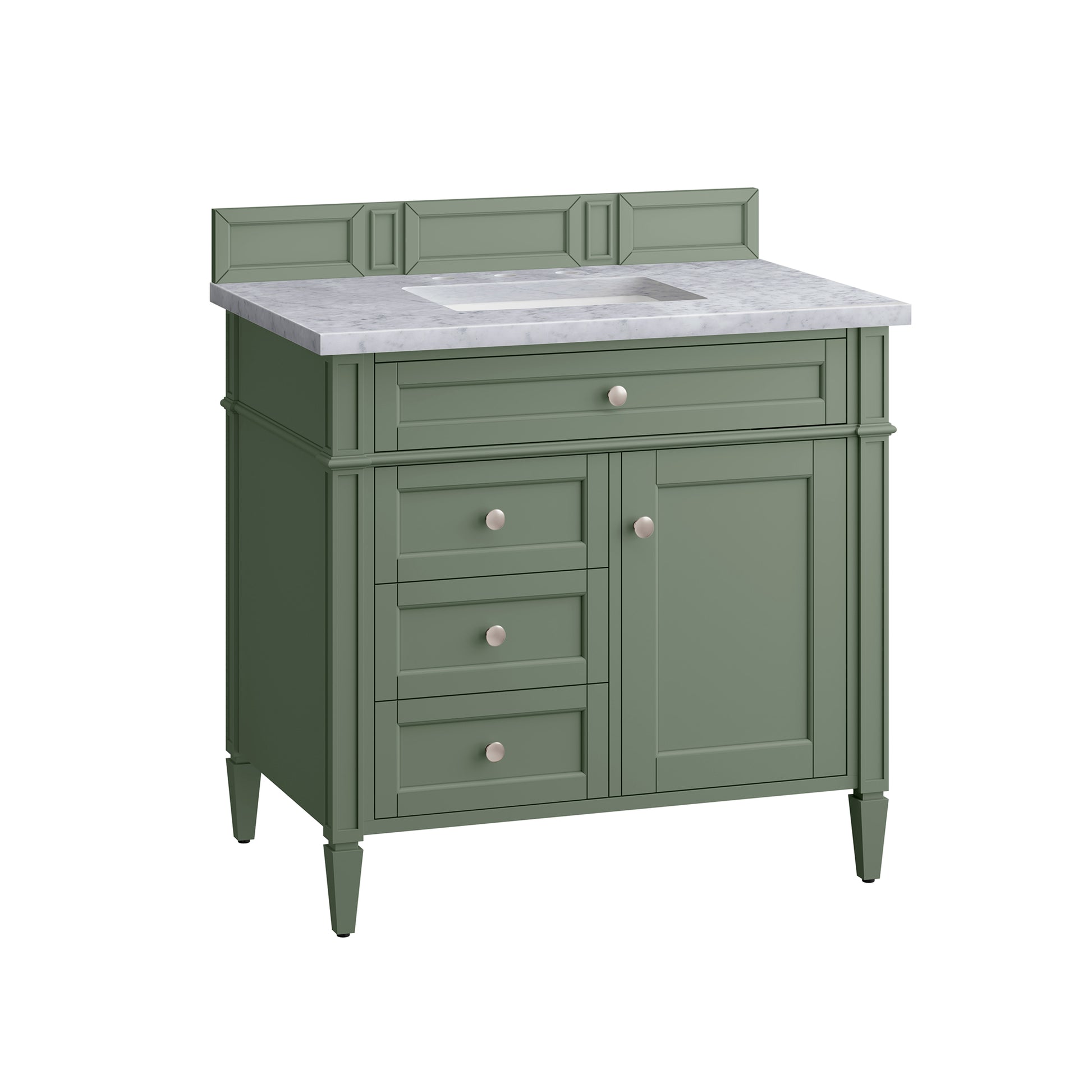 The Smokey Celadon finish on the 36" Brittany Single Vanity adds a refreshing, natural element to any bathroom space. This moody, yet muted green, with subtle blue and grey undertones, brings the rich, timeless details of the Brittany collection to life. The 36" cabinet, with decorative wood backsplash, features optimal organization with one hide-away tip-out drawer plus two side drawers, one of which is a double height for storing taller items while the other contains a removable bamboo organizer tray. This cabinet also has one door, which conceals an interior shelf. All drawers are lined with an aluminum laminate surface for easy cleaning and are equipped with undermount soft-close slides. The look is completed with a 3 CM eased-edge countertop by Cosentino in White Zeus, which gives a crisp and clean finish to your vanity. It includes one pre-drilled hole for a single-hole faucet (not included), one matching stone backsplash, one white porcelain rectangular sink, as well as the appropriate mounting brackets for installation.