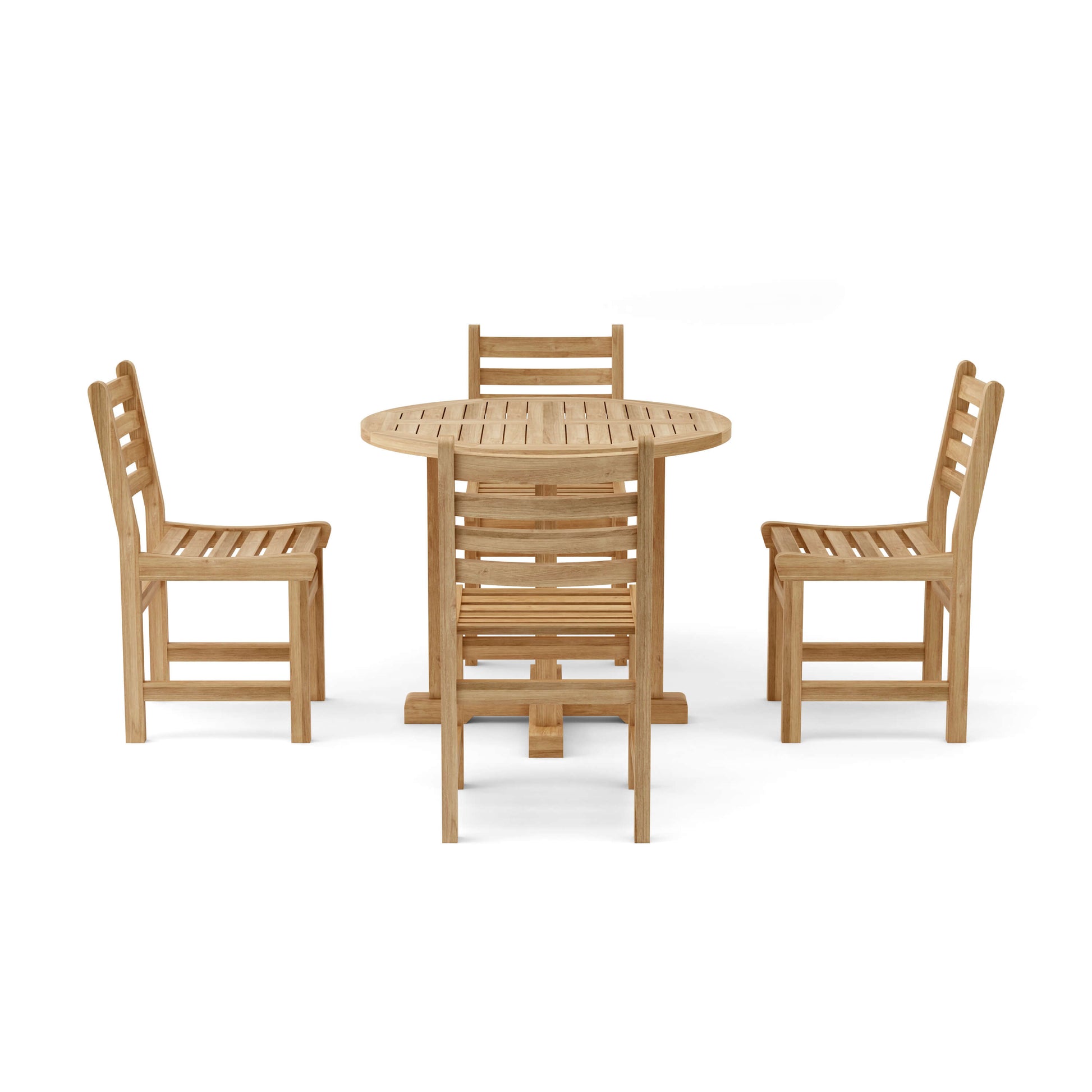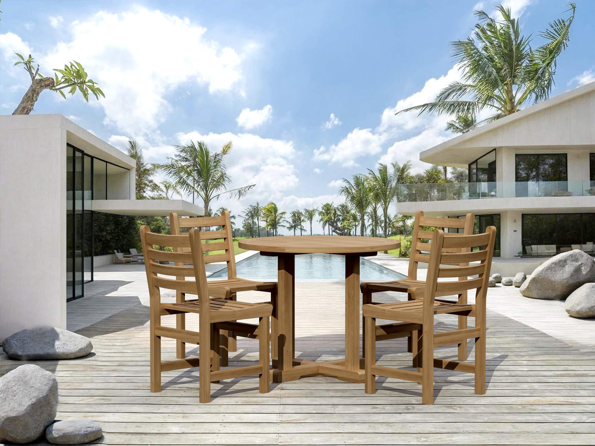 Get ready to elevate your outdoor living with the Montage Windham 5-piece dining set B from Anderson Teak®. This stunning dining set will effortlessly bring style and glamour to your outdoor space. Designed to shine, this gorgeous set is sure to impress. Accessories are not included, and the tabletop does not have an umbrella hole. Embrace luxury and sophistication with the Montage Windham dining set, the perfect addition to your outdoor oasis.