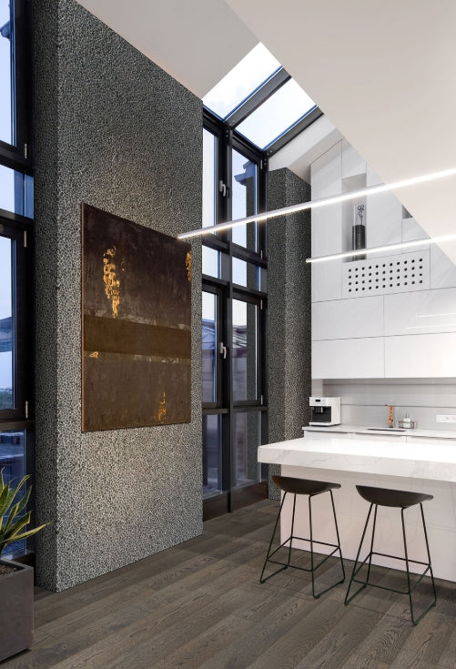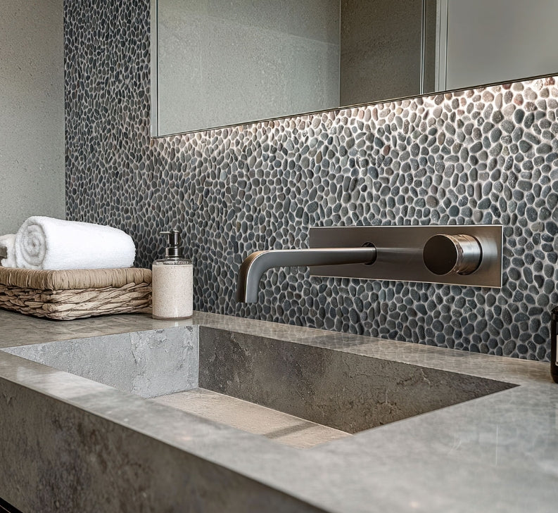 Noir Ash Mini Pebble marble, featuring a rich black tone, offers a tumbled finish that brings rugged elegance to any space. The mosaic's mesh-back design ensures easy installation, making it ideal for accent walls, backsplashes, and residential floors in both indoor and outdoor areas, including kitchens, shower areas, and more. Perfect for residential and commercial applications, this versatile tile seamlessly combines natural beauty with practical functionality.