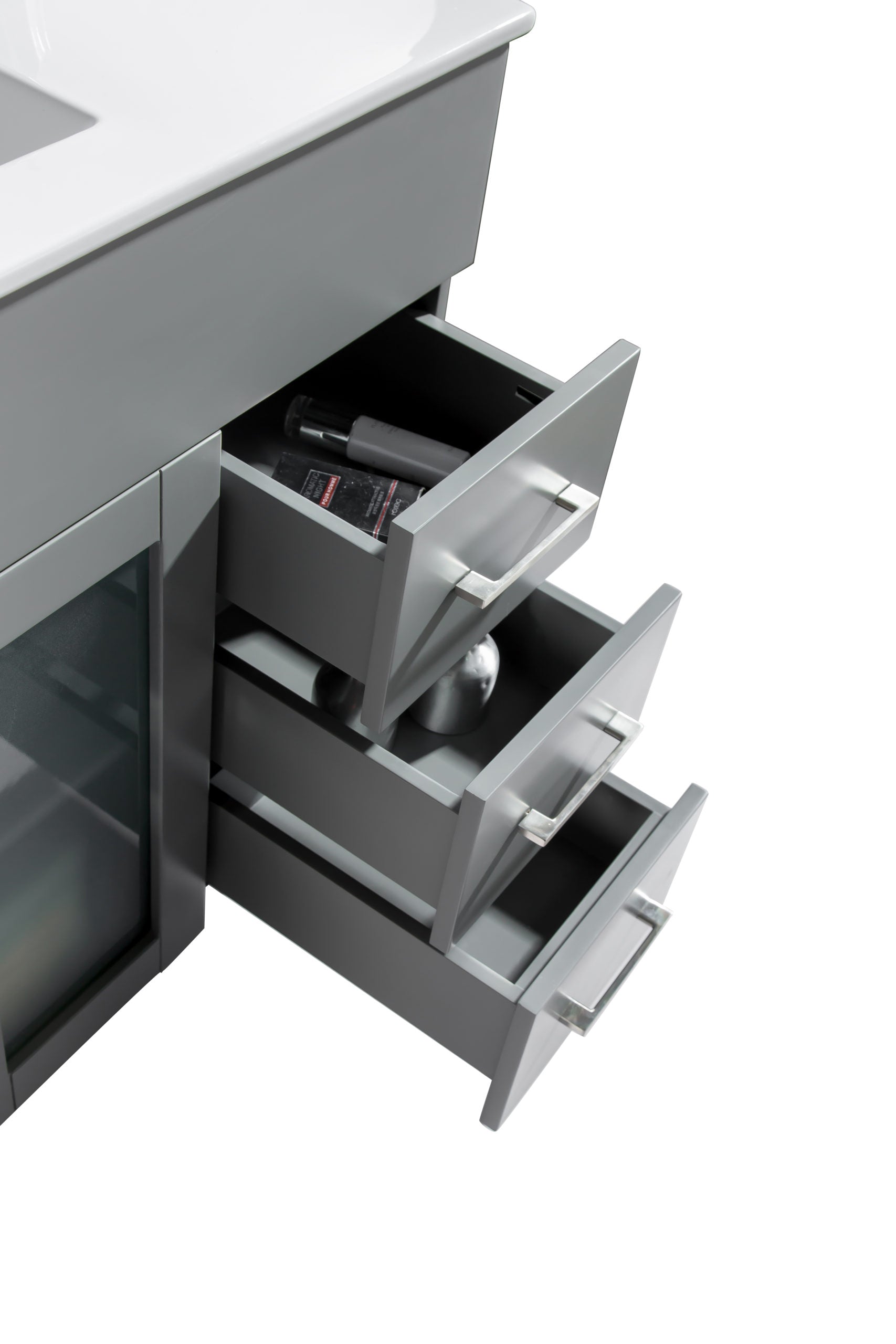 The Nova Collection offers a modern yet contemporary design without sacrificing functionality. This elegant collection offers 2 doors and many full extension drawers with soft closing hinges and rails, so you’ll never hear the door slam. The sleek ceramic basin has a modern rectangular seamless sink with an overflow. This stylish vanity has immaculate finish options including: White, Grey, Espresso, and Brown.