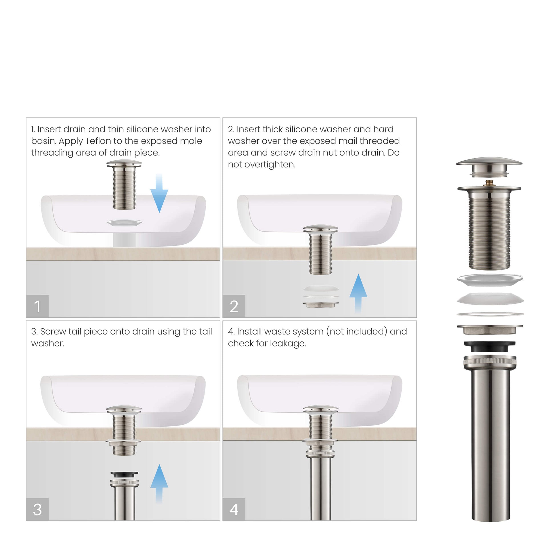 - Easy to install: drain, thin rubber washer, thick rubber washer, hard washer, drain nut, the tail piece are all included. please follow the installation guide to ensure no leak.