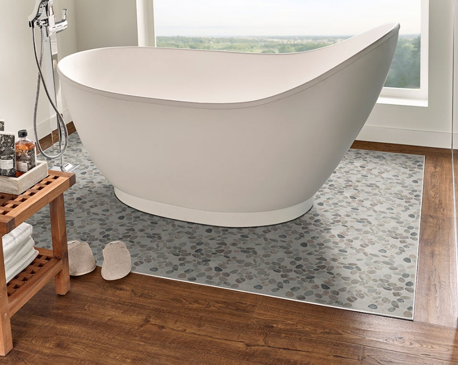 Puebla Greige Pebble is a handsome and elegant mosaic featuring tumbled marble stones that appear like smooth pebbles. In an artistic mix of muted creamy whites, dusty grays, and barely beiges, this marble pebble backsplash gives your project a signature look without sacrificing durability. Use it on hardworking surfaces like mudroom or shower floors, or install it as a shower surround, fireplace facade, or backsplash. This tile is Greenguard Indoor Air Quality Certified® and comes mounted on mesh-backed sheets for simplified installation and a professional finish. It also pairs well with other glass mosaics, wall tile, and floor tile.