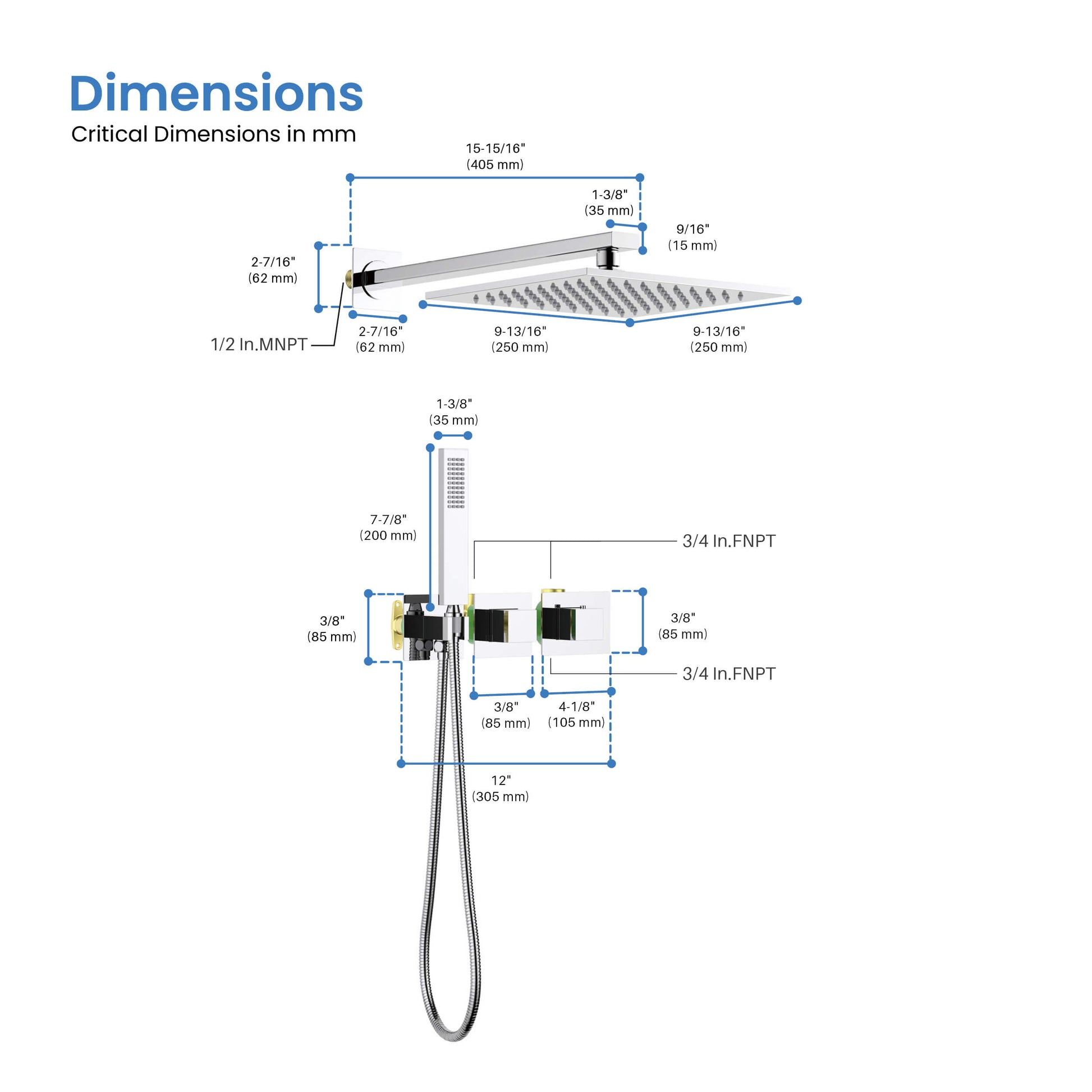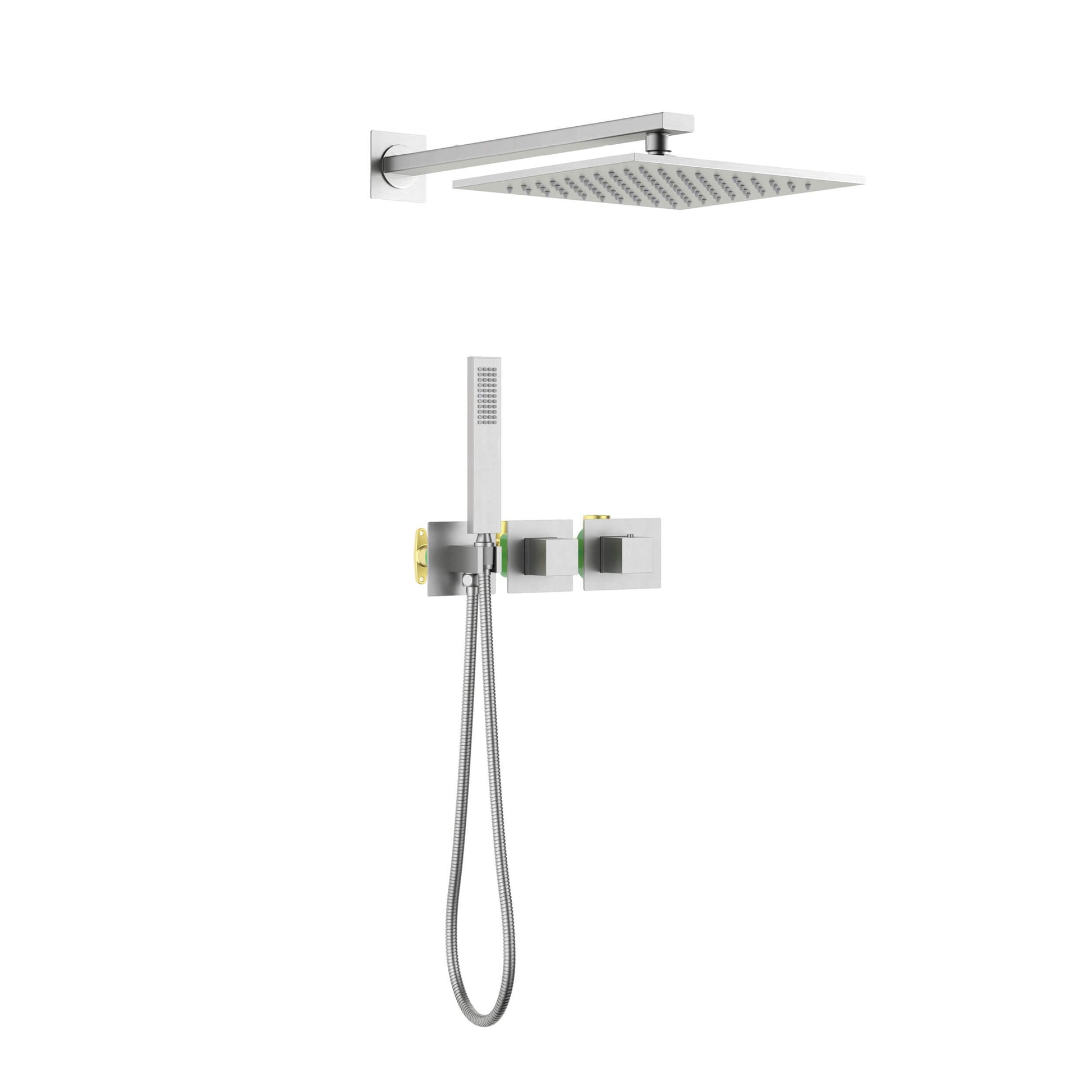 - Dual Function: 10" stainless steel rain shower + brass handheld shower