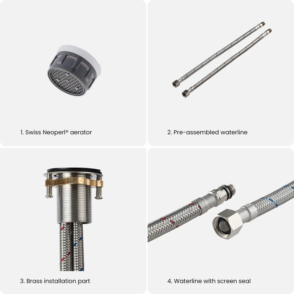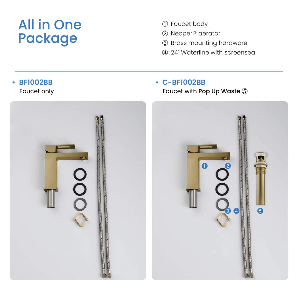 INCLUDED: Faucet, Pop Up Drain, Pre-assembled Waterlines, Brass Mounting Hardware.