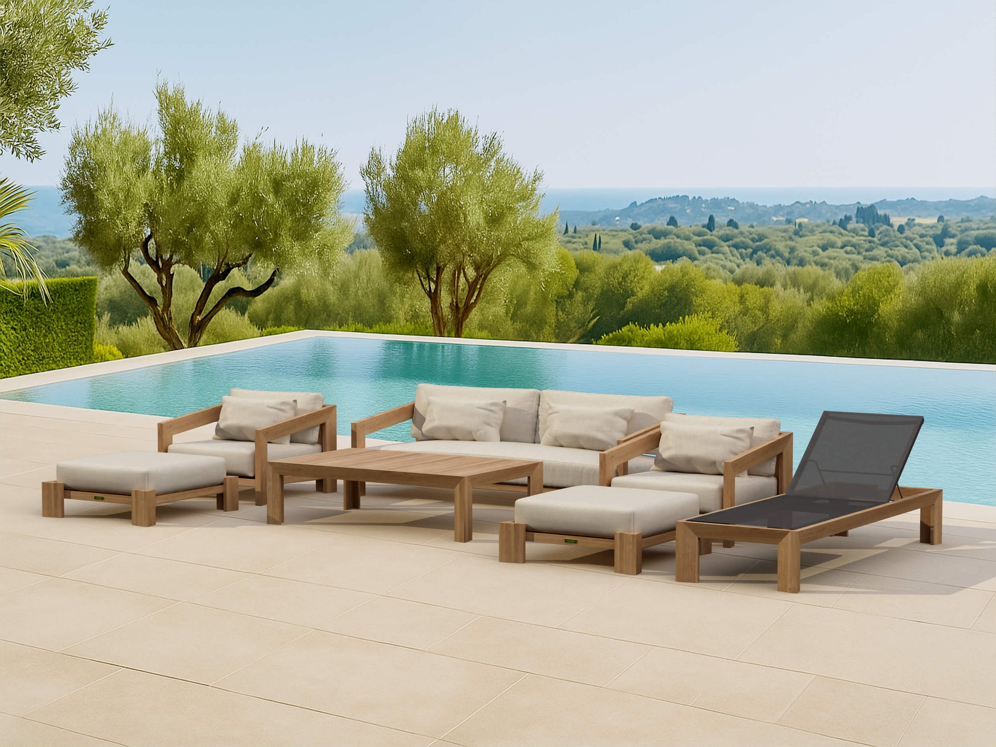 The Smyrna Deep Seating Set combines modern elegance with everyday comfort, creating the perfect centerpiece for your outdoor living space. This complete set includes two generously sized lounge armchairs, a spacious three-seater sofa, two matching ottomans, a rectangular coffee table, and a Sun Lounger. The Smyrna Sofa comfortably seats up to three people with its expansive 82? length, while each lounge armchair provides ample space at 34?W x 34?D. The two ottomans are designed to complement the seating pieces, adding both versatility and visual harmony to the set. Crafted for durability, the Smyrna Coffee Table arrives fully assembled and features wide, solid teak slats. Each piece in the collection is built from premium, unfinished teak and paired with 7? thick cushions upholstered in all-weather Sunbrella® fabrics—renowned for their strength, beauty, and low maintenance. Timeless in design and built to endure the elements, the Smyrna Deep Seating Set promises years of lasting comfort and enjoyment outdoors.