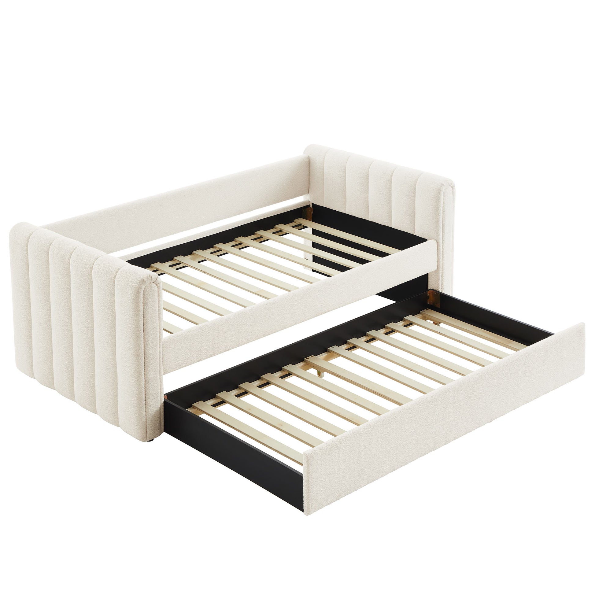 The Veyla Daybed blends sleek form and cozy texture with a streamlined silhouette and channel tufted detailing. Upholstered in soft, touchable boucle fabric, this twin size daybed with trundle offers a versatile sleeping solution for guest rooms, kids’ bedrooms, or multifunctional living areas. The fully upholstered frame features a low profile, gently padded sides, and tailored vertical channel tufting for a refined look. A hidden pull-out trundle on casters tucks beneath the main bed, creating a seamless twin-over-twin bed layout ideal for overnight guests or everyday lounging. Veyla’s built-in wood slat support system ensures lasting durability without the need for a box spring. Mattress not included. Assembly required. Weight Capacity: 300 lbs.
