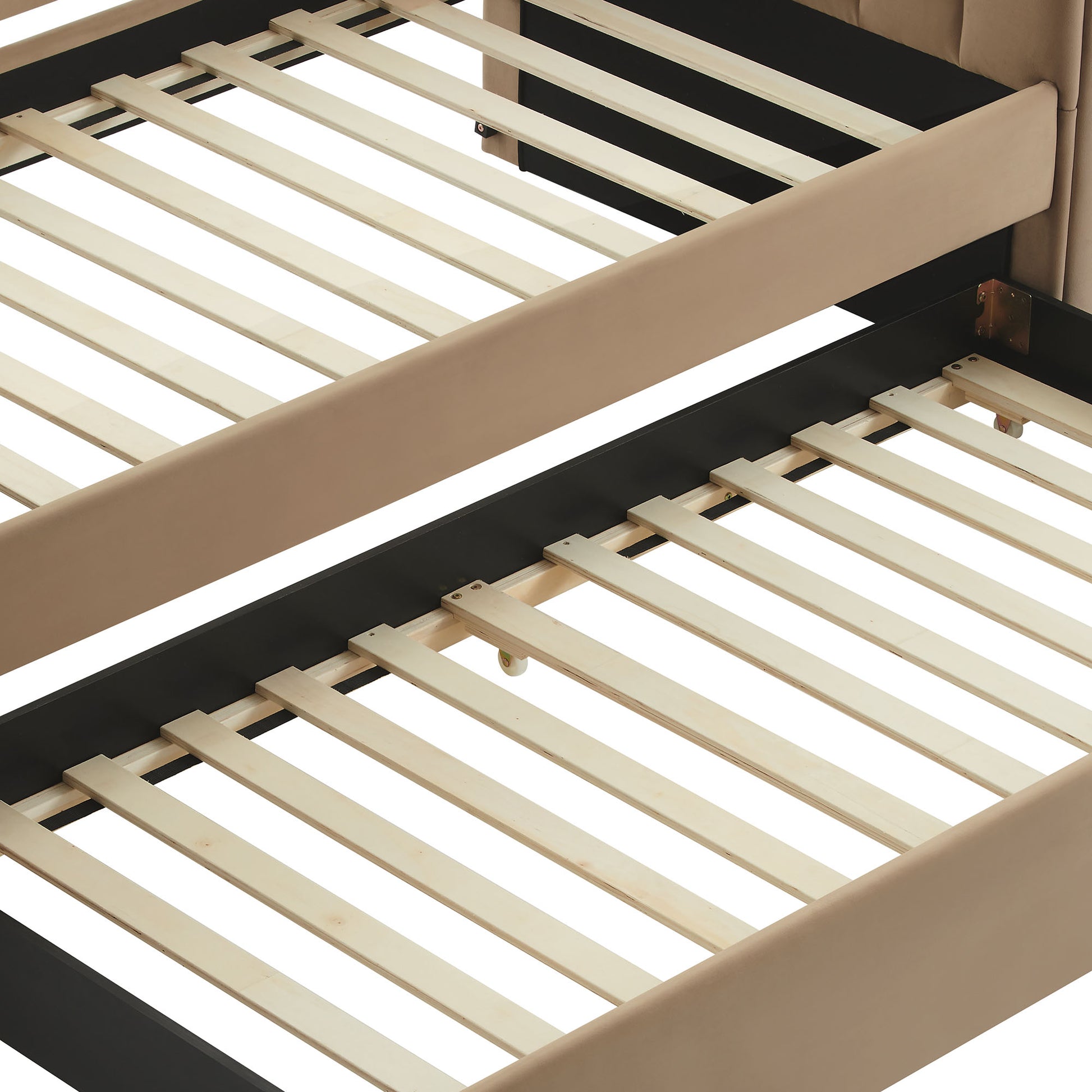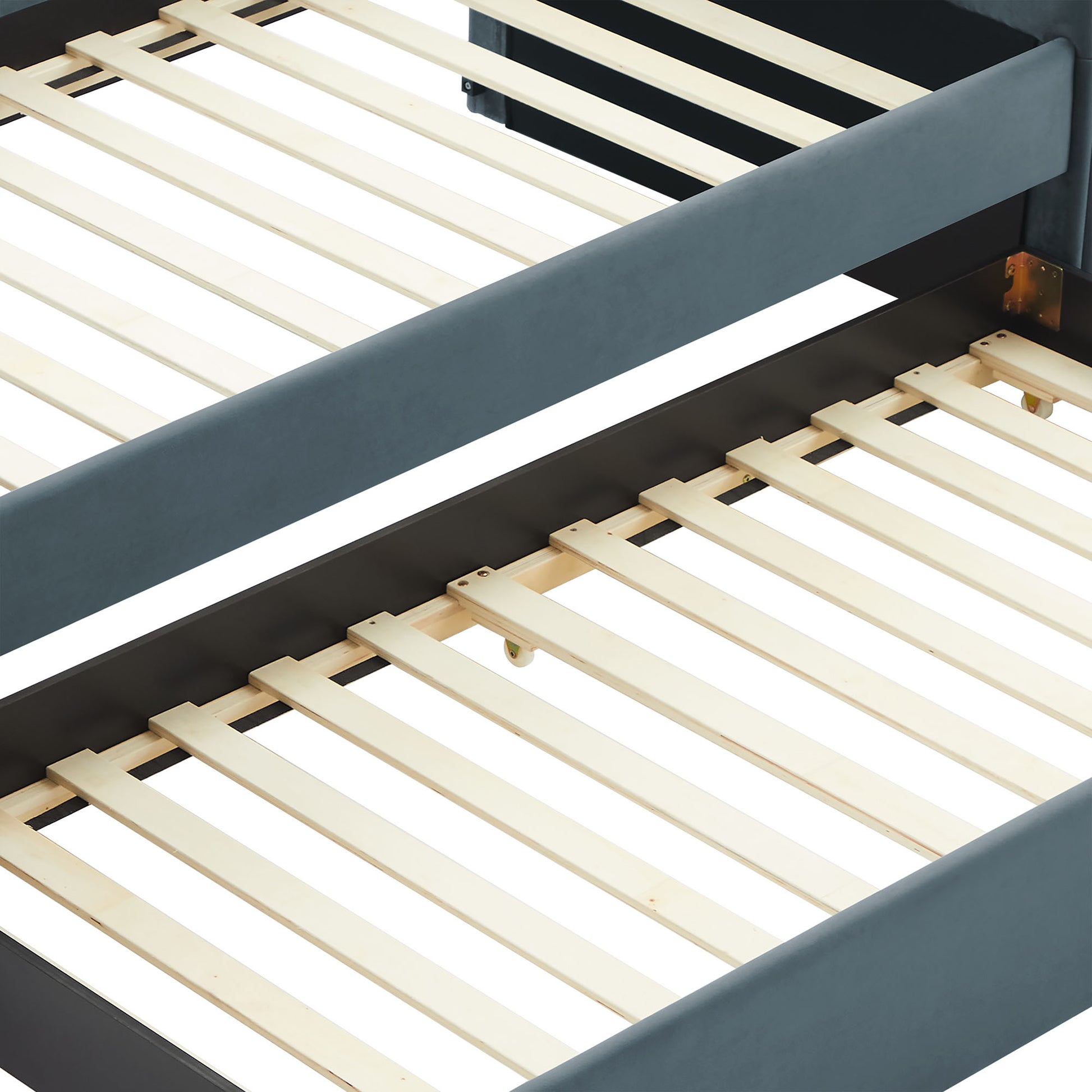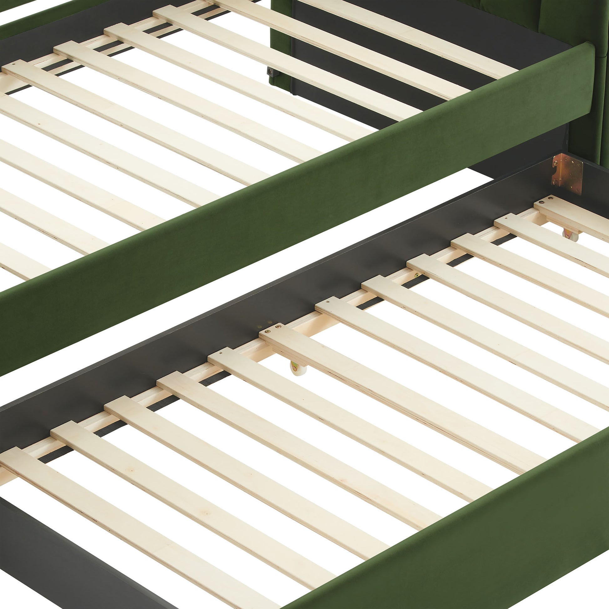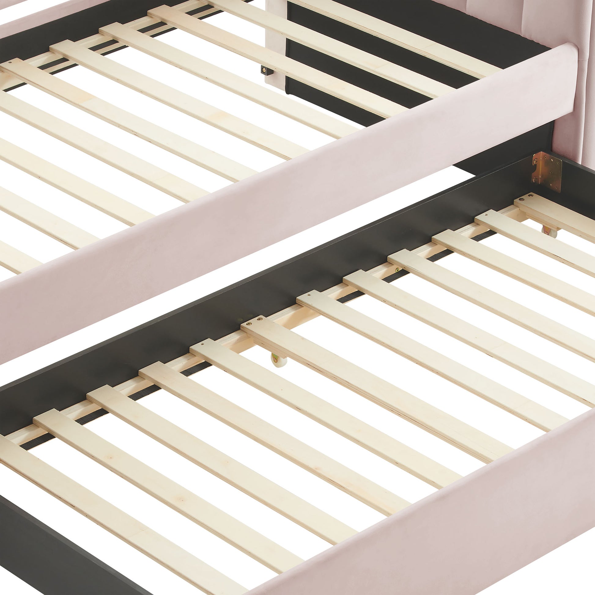 The Veyla Twin Daybed blends sleek form and plush texture with a streamlined silhouette and channel tufted detailing. Upholstered in soft, stain-resistant performance velvet, this twin size daybed with trundle offers a versatile sleeping solution for guest rooms, kids’ bedrooms, or multifunctional living areas. The fully upholstered frame features a low profile, gently padded sides, and tailored vertical channel tufting for a chic look. A hidden pull-out trundle on casters tucks beneath the main bed, creating a seamless twin-over-twin bed layout ideal for overnight guests or everyday lounging. Veyla’s built-in wood slat support system ensures lasting durability without the need for a box spring. Mattress not included. Assembly required. Weight Capacity: 300 lbs.