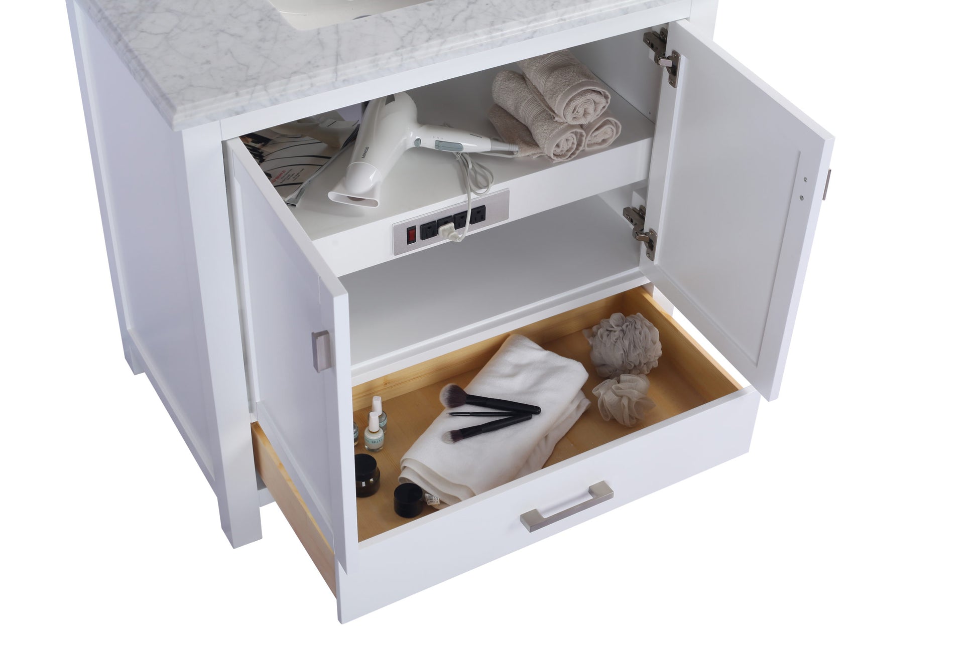 The Wilson Collection is a uniquely simple yet attractive collection. It features recessed panel doors with a shaker style design that is inset within the cabinet frame. The shaker style cabinets is inspired by the furniture designed by the Shakers, who were extremely skilled craftsmen and carpenters. Not sacrificing quality, the Wilson Collection is constructed with solid oak wood, includes high quality soft closing rails and hinges, and solid wood, dovetail construction drawers. Additionally, with functionality in mind, there are 4 electrical outlets inside the cabinet to keep all your electronics plugged in and ready to use. This collection offers a variety of colors and sizes to fit your bathroom.