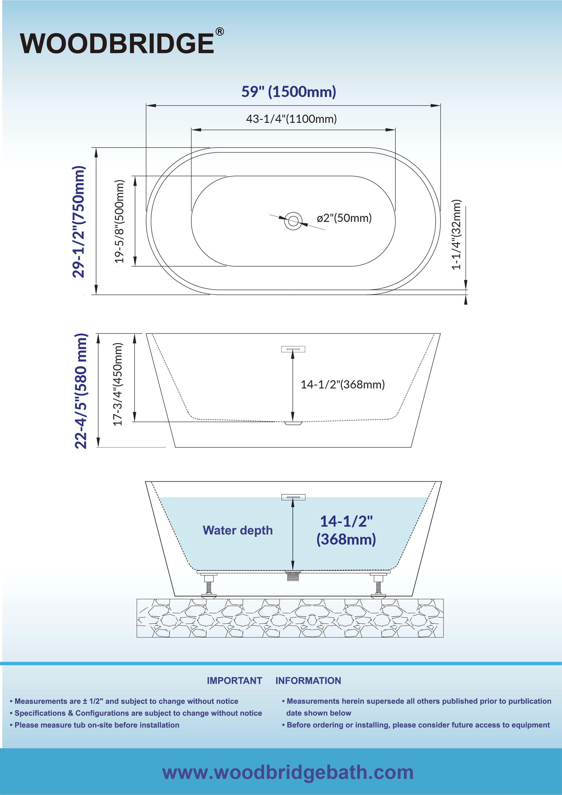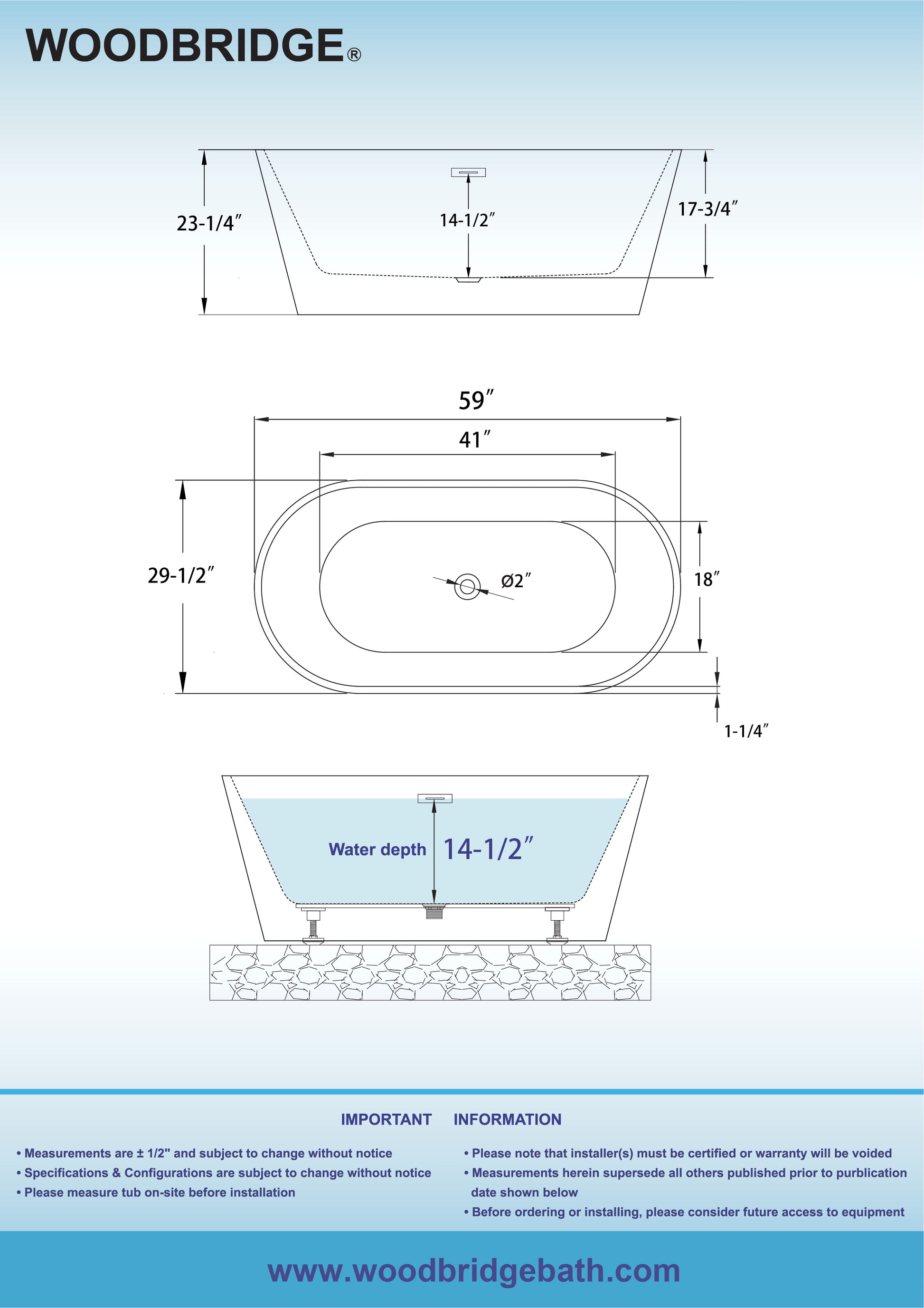 [DIMENSIONS AND SPECIFICATIONS]: Exterior dimensions: 59" Length x 29-1/2" Width x 23-1/4" Height; Internal dimensions: 41"Length x 18" Width; Water Depth to Overflow: 14-1/2" Deep. Effective Tub Capacity: 57 Gallons.