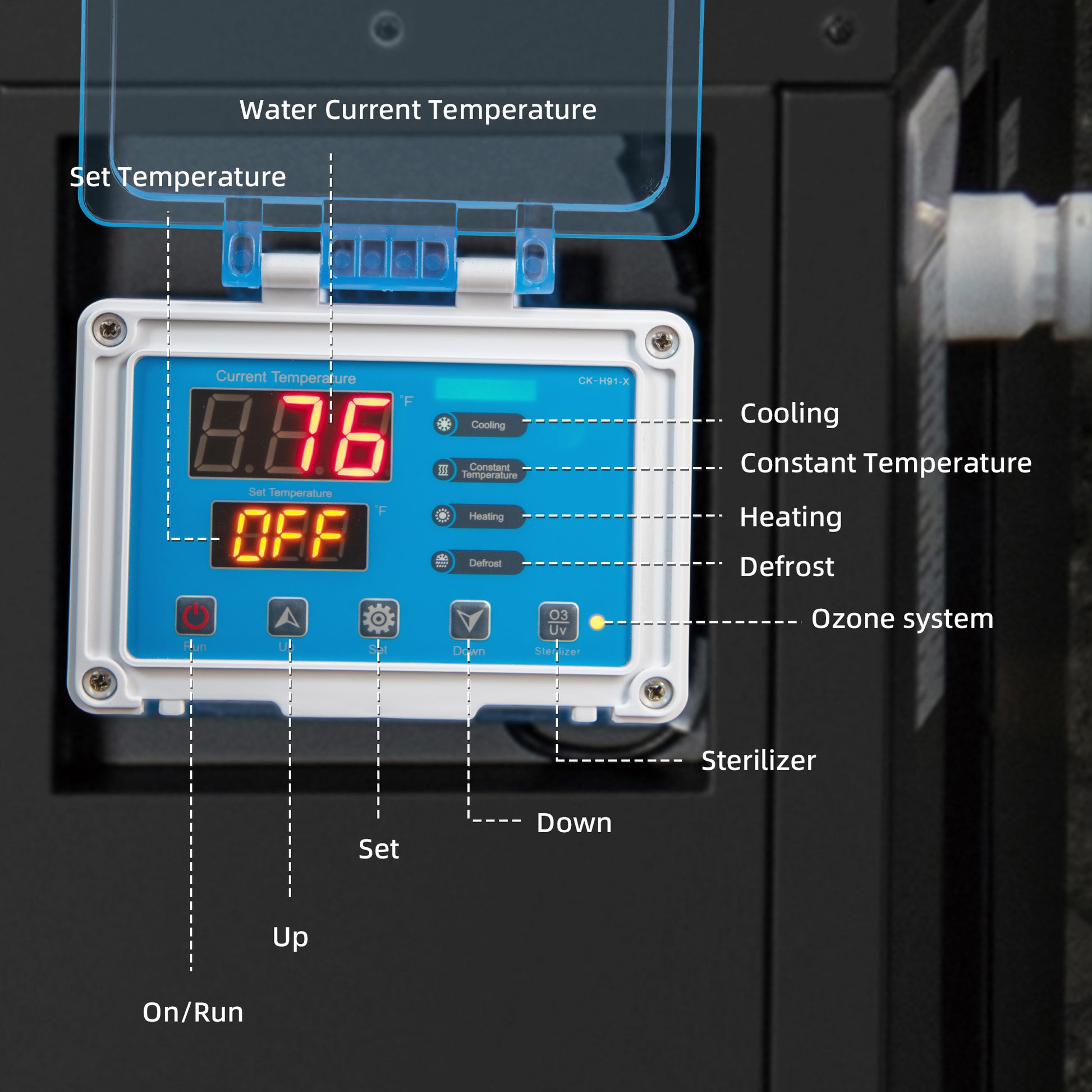 [INTEGRATED CHILLER SYSTEM]: Ultra-Efficient, Integrated Chiller with cooling and heating in one, keeps water temperatures between 40 – 104 ° F and chill down 7 - 10 ° F water temperature per hour. *value can vary depending on starting water temperature , outside temperature and ambient heat.