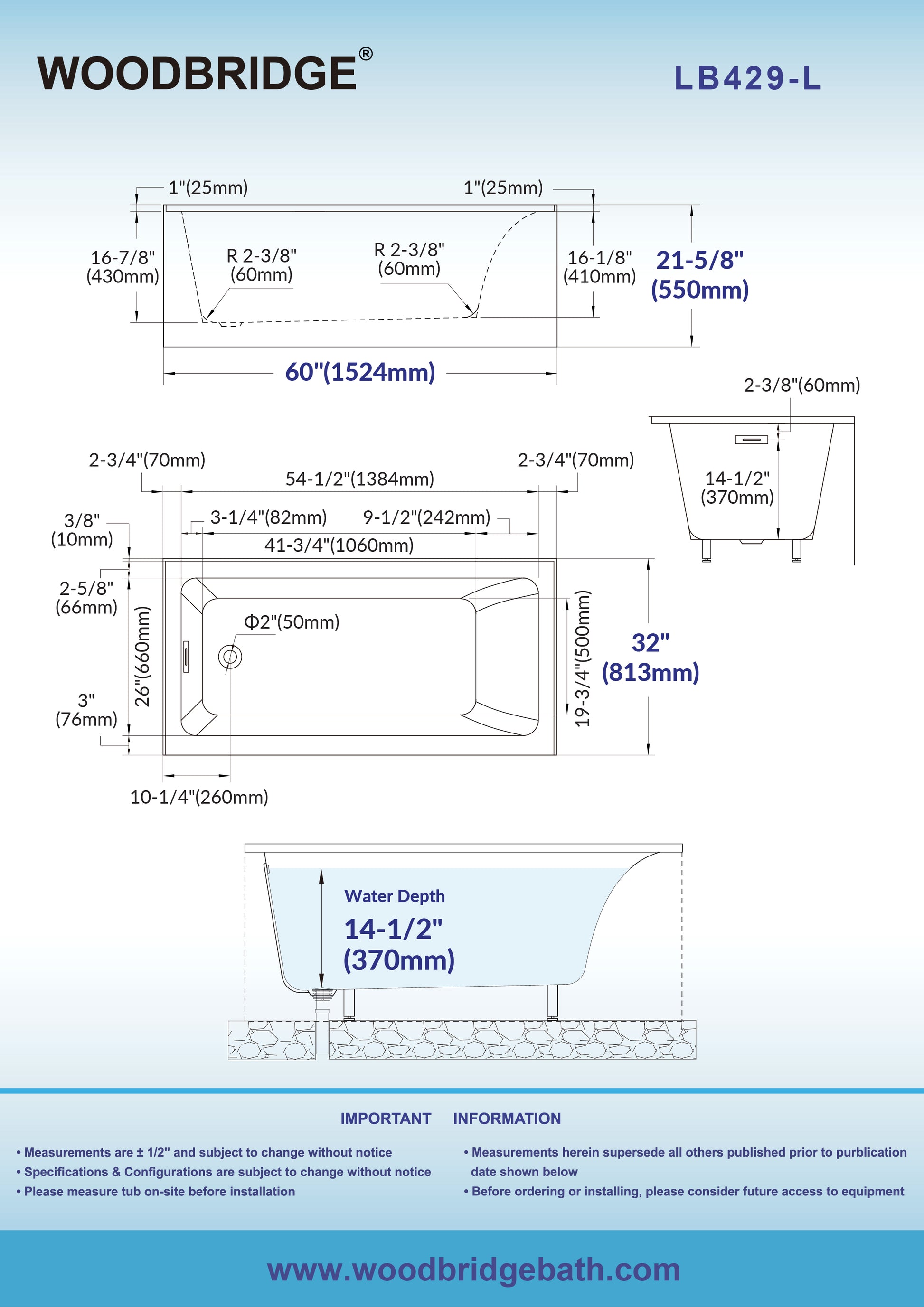 [Dimensions and Specifications]: External Dimension]: 60" x 32" x 21-5/8". Internal Dimension: 54-1/2" x 26" x 16-1/8" (D1) / 16-7/8" (D2). Seating Area: 41-3/4" x 19-3/4". Integral front skirt and tiling flange for easy installation.