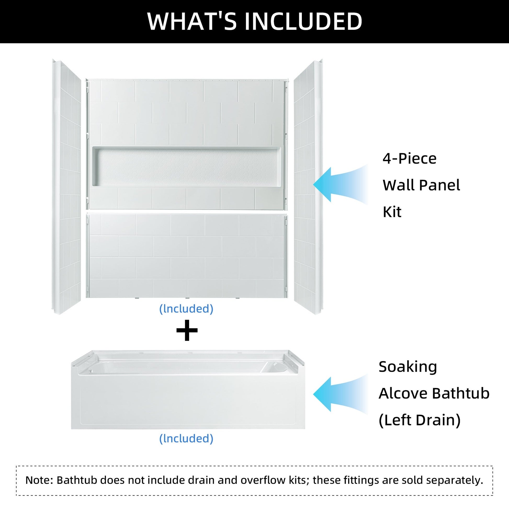- Complete Combo Set: Includes one 60" L x 32" W x 17" H soaking alcove bathtub (right or left drain) and one matching 4-piece wall panel kit in classic white.