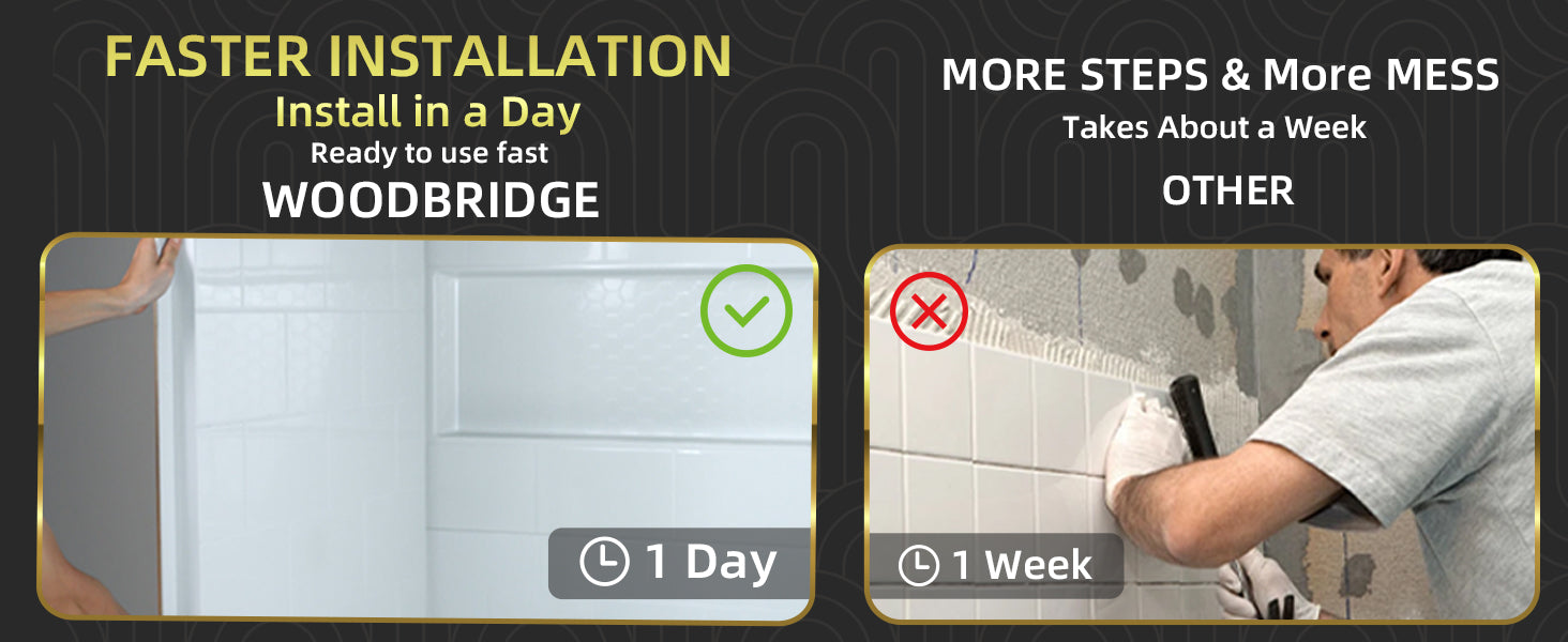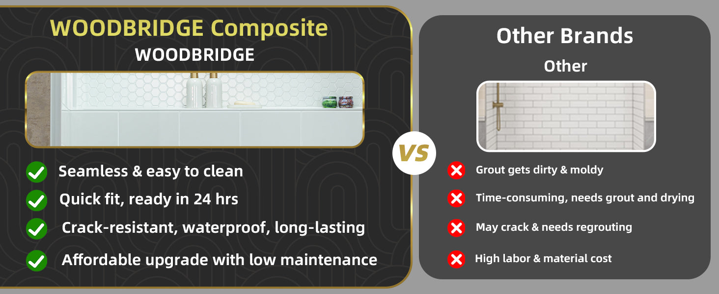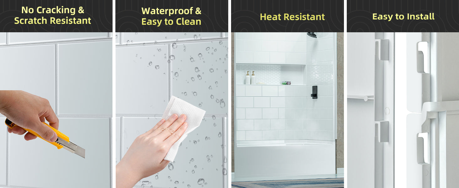 - Grout-Free, Seamless Look: Smooth, non-porous surface eliminates traditional tile grout lines, making the system easier to clean and more resistant to mold and mildew.
