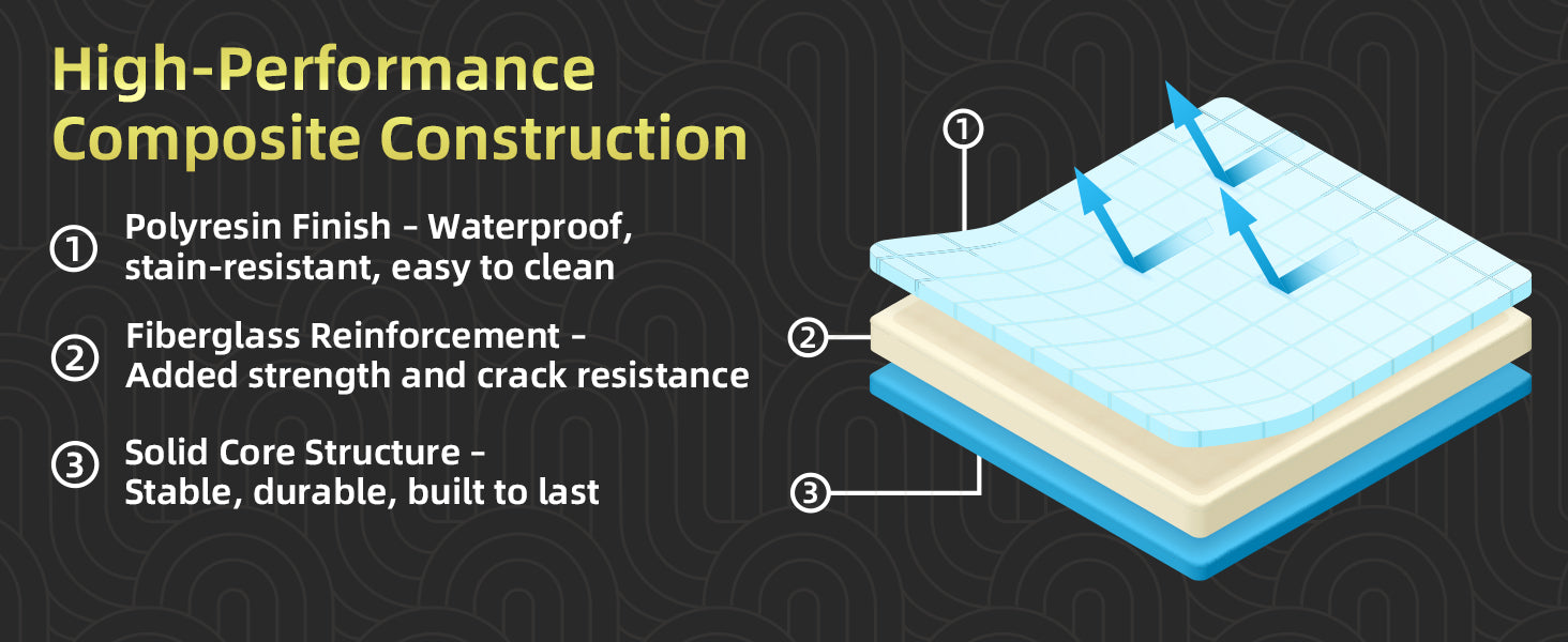 - Durable Composite Construction: Premium composite material is stronger and lighter than many solid-surface options, resisting scratches, stains, and everyday impacts.