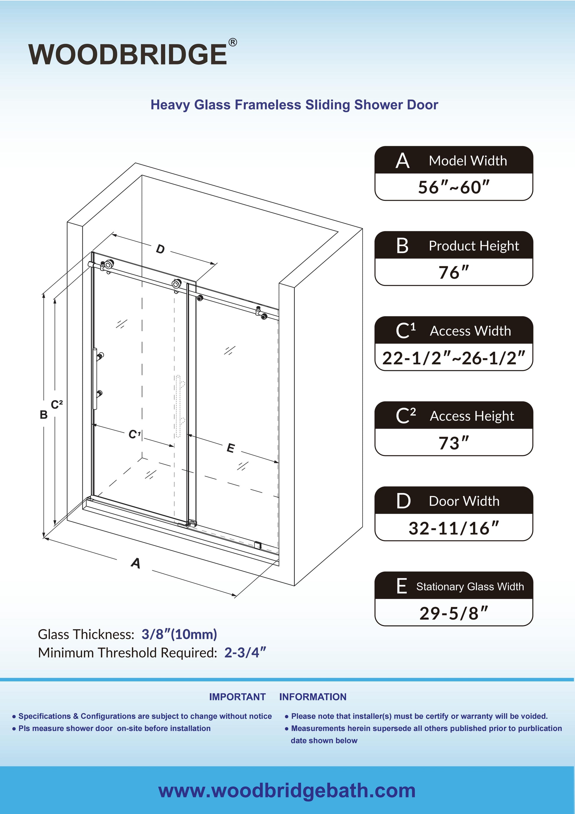 WOODBRIDGE MBSDC6076 Frameless Double Sliding Shower Door 56–60" x 76"