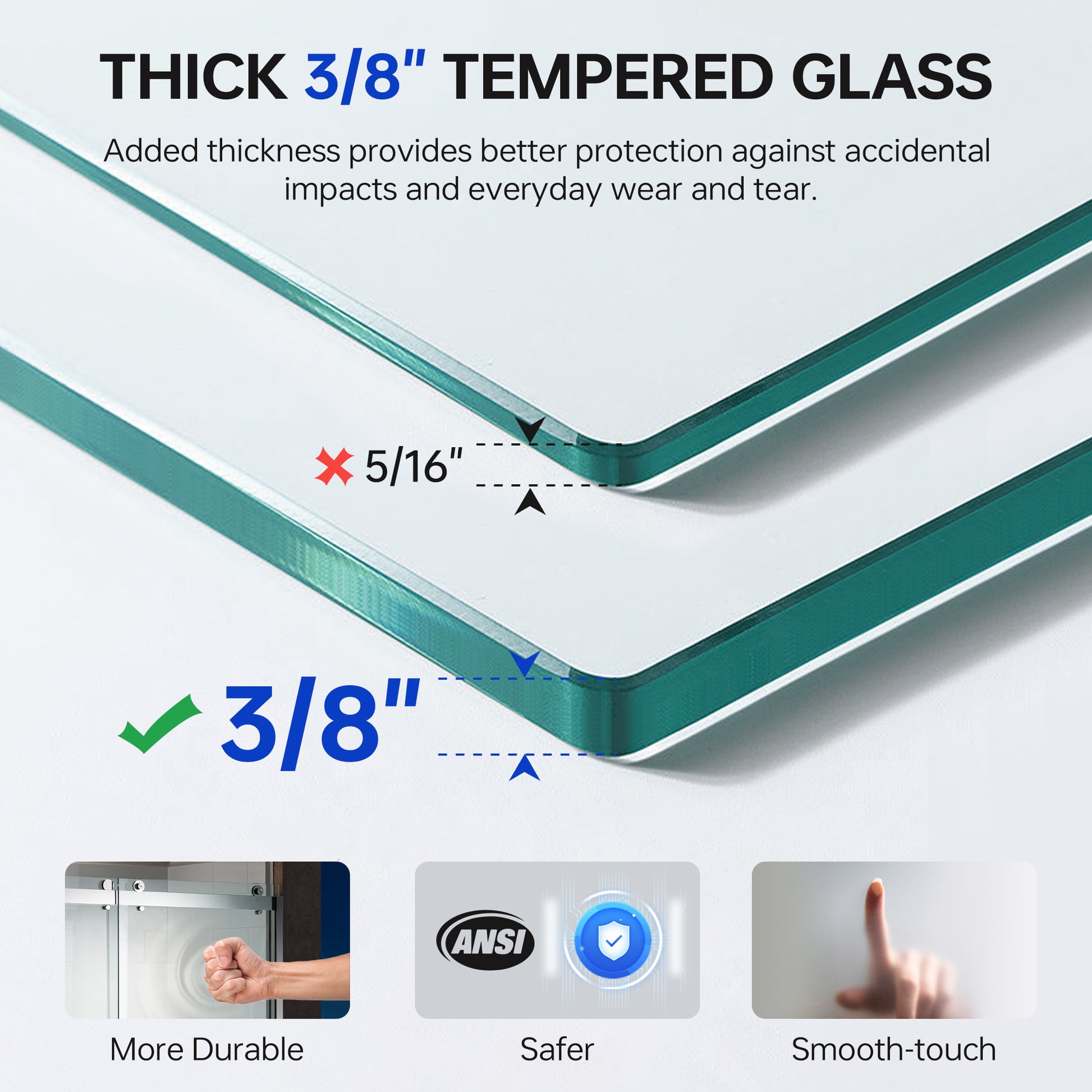 - Tempered Safety Glass: 3/8" (10 mm) ANSI Z97.1 certified clear glass.