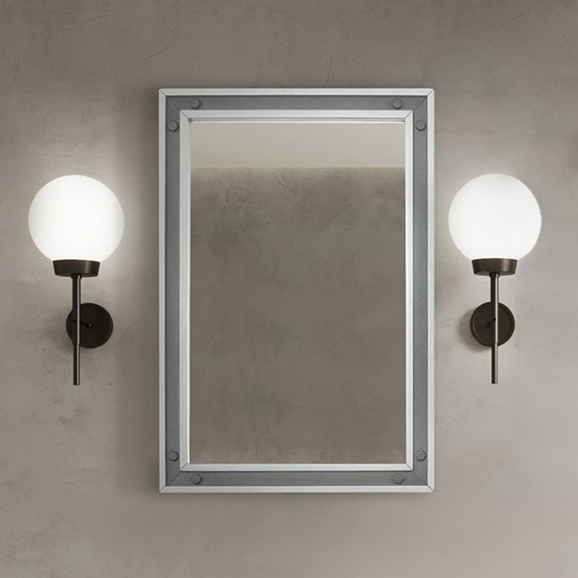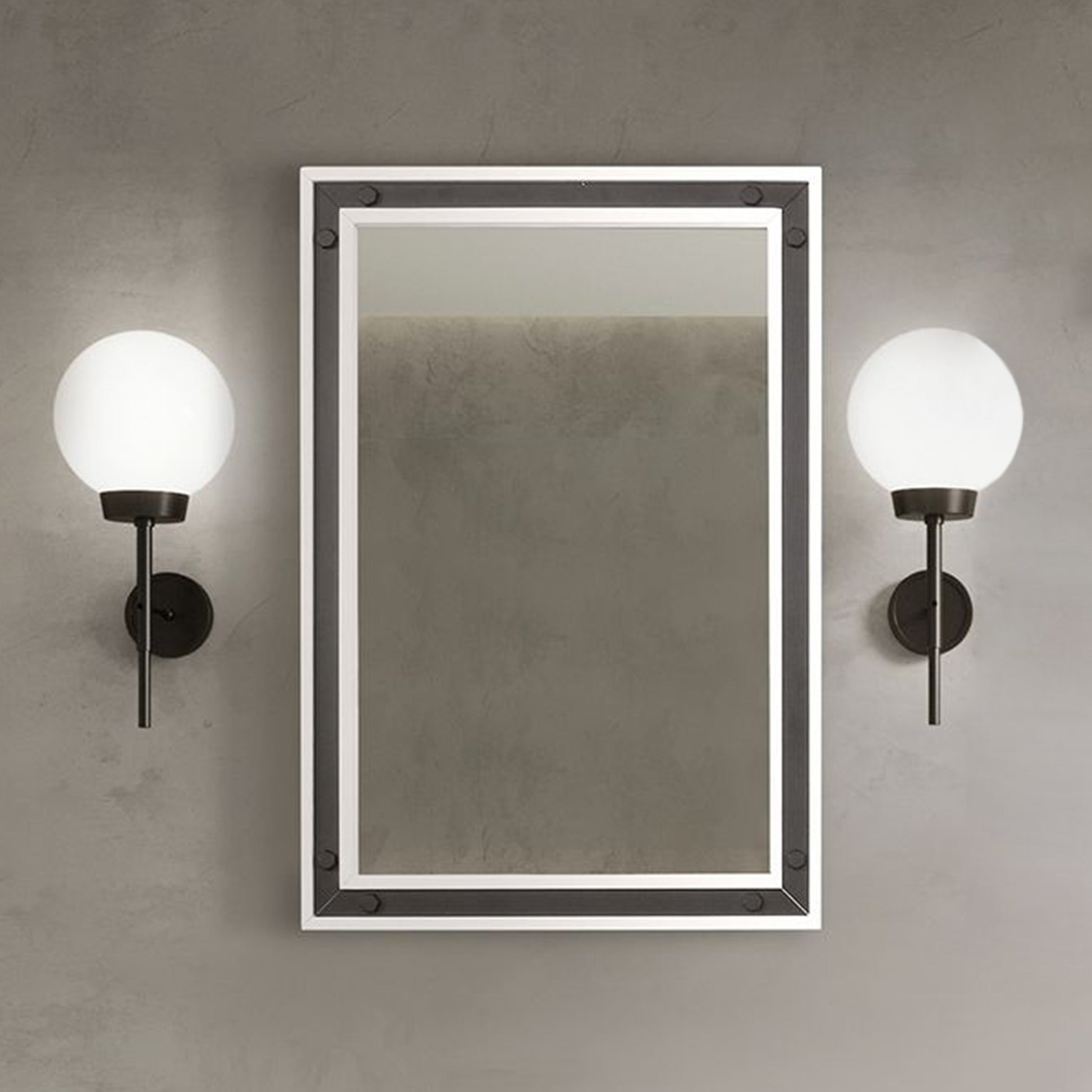 - Dark Grey finish framed mirror with black metal inlay exhibits a rustic appearance