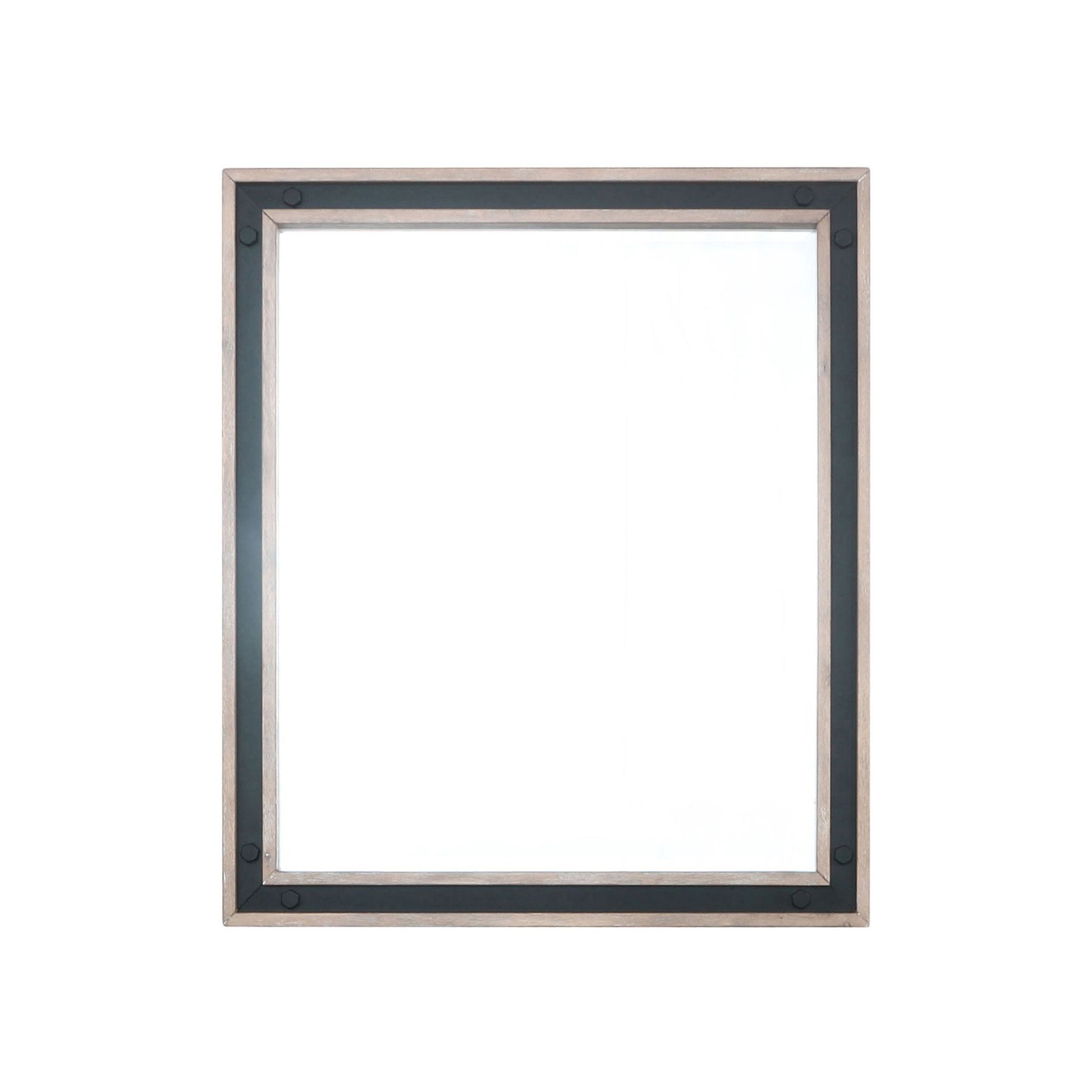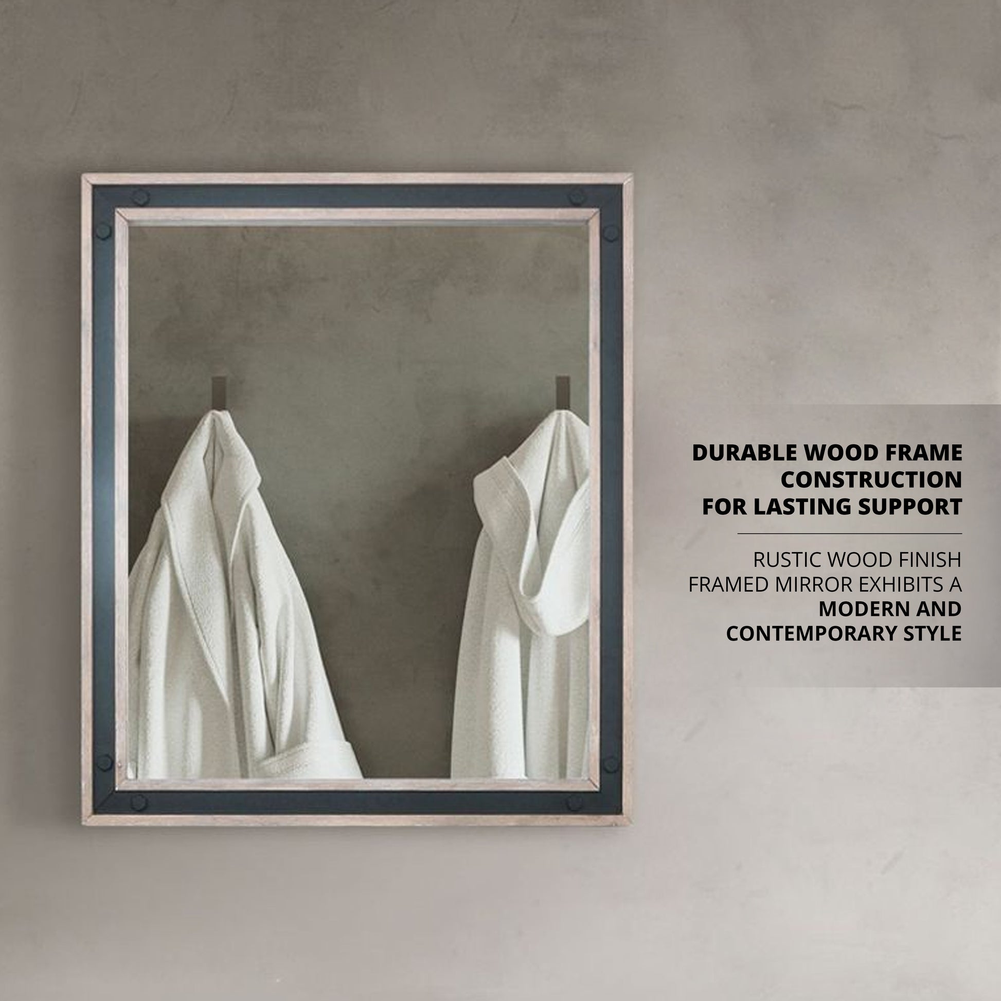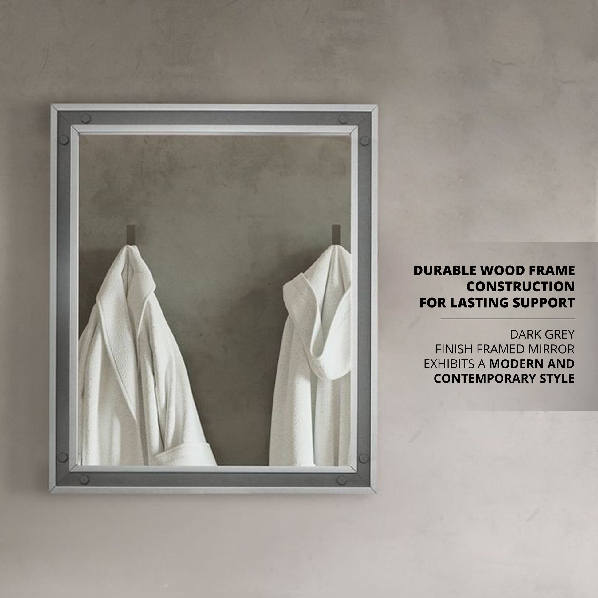 - Dark Grey finish framed mirror with black metal inlay exhibits a rustic appearance