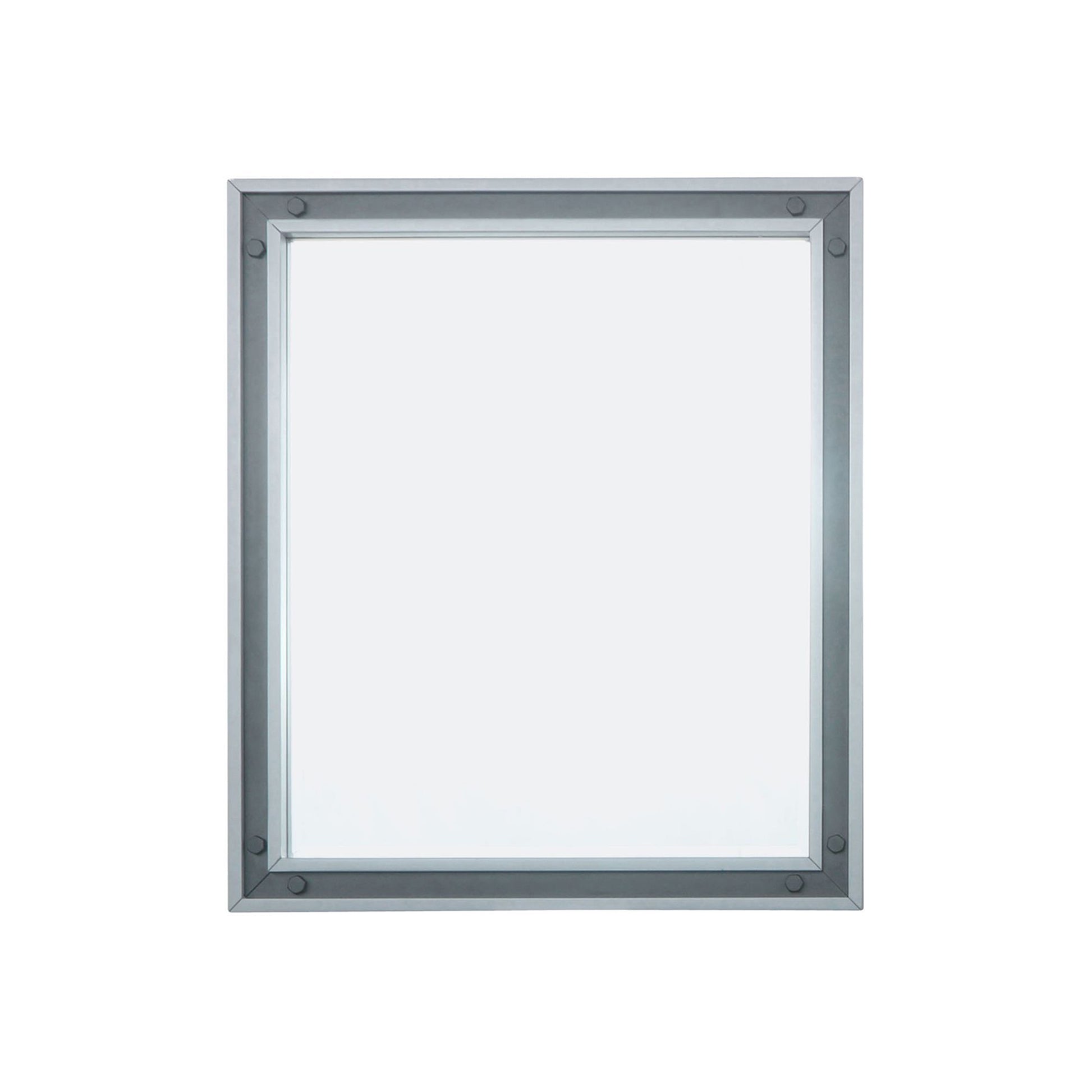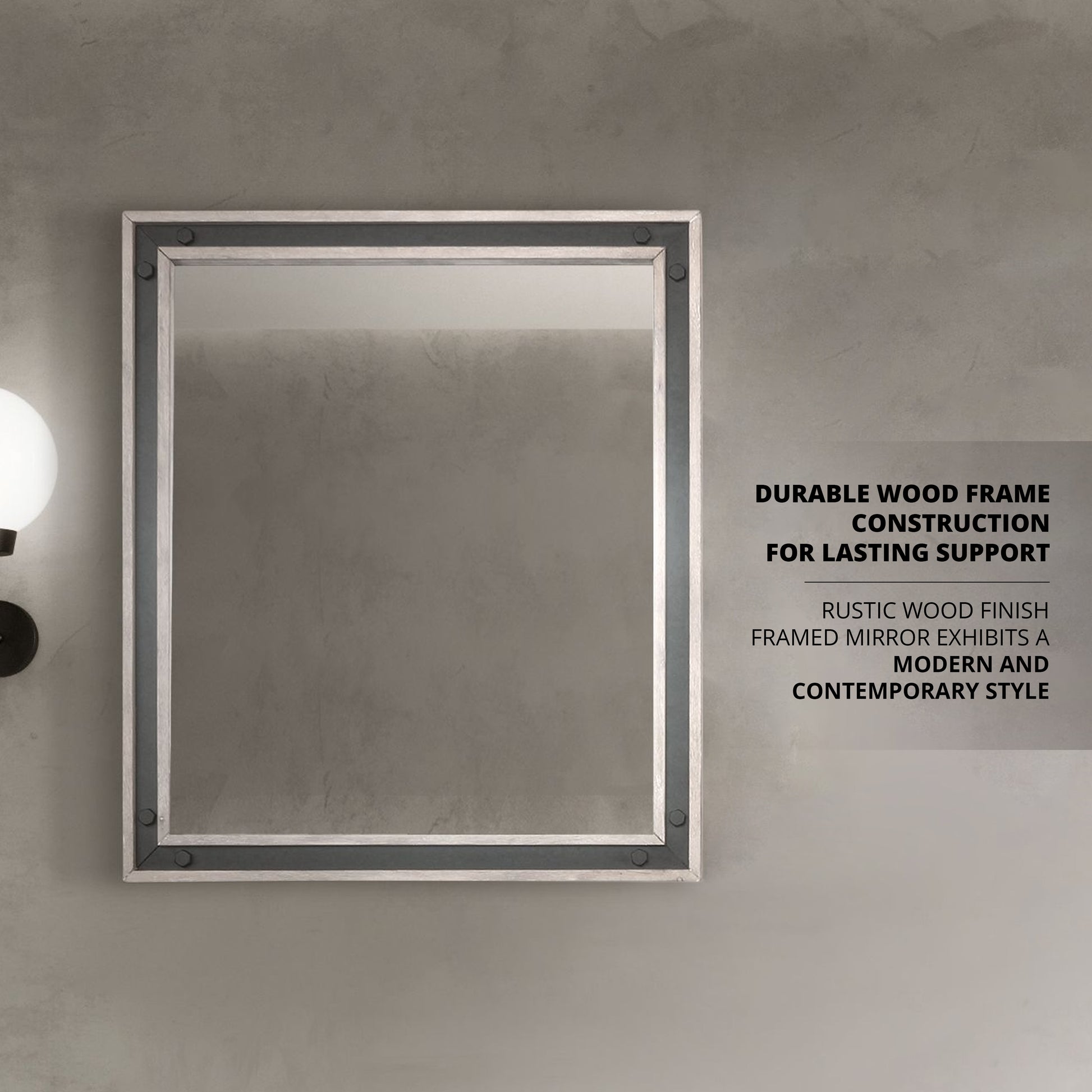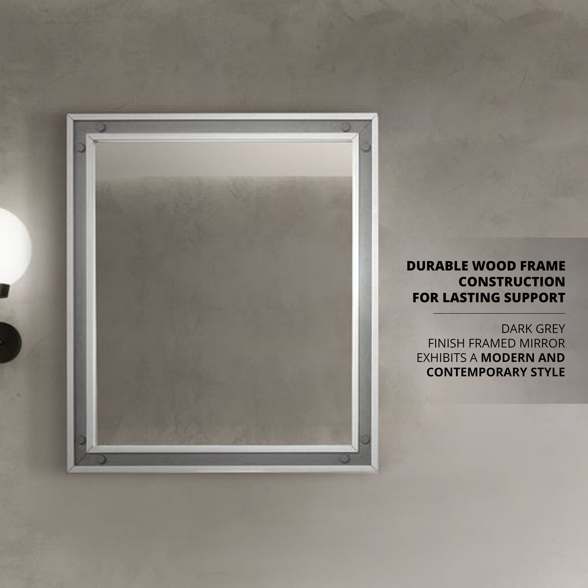 - Dark Grey finish framed mirror with black metal inlay exhibits a rustic appearance